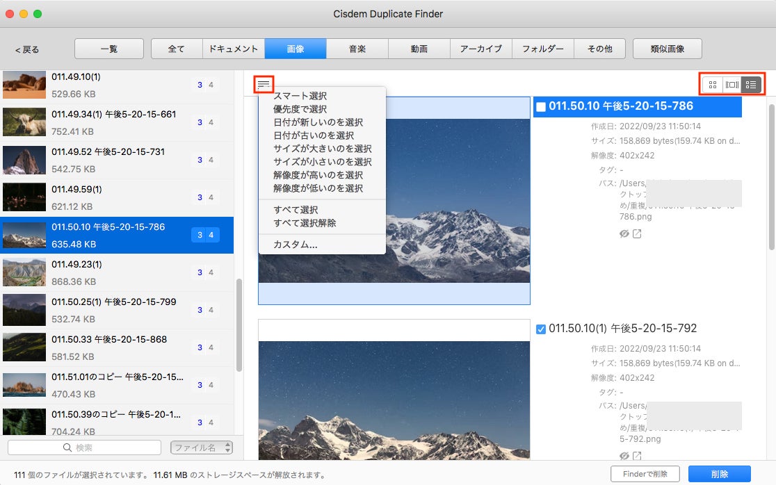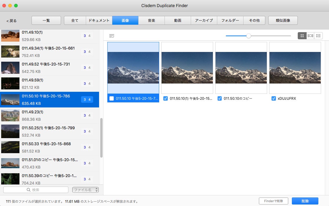 Cisdem Duplicate Finderは高度な検索アルゴリズムで重複写真を検索します。ファイル名、ファイルサイズ、作成日、解像度、そして具体的な内容に基づいて完全に重複した写真を見つけ出してくれます。このソフトはMacに対応しますので、「写真」アプリ、iPhoto、ミュージック、iTunesから重複項目を検索できます。各グループの重複写真からたった一枚の写真が残され、他の写真は自動で選択されます。ユーザーはワンクリックで大量の重複写真を削除できます。