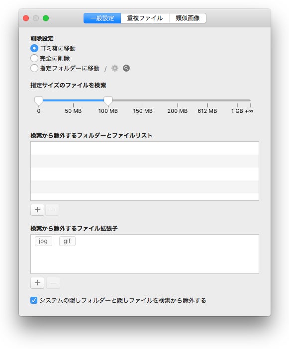 一般設定画面でファイルのサイズを指定して検索できます。また、ファイルの拡張子を追加することで特定のファイルを検索から除外でき、検索速度が上がります。