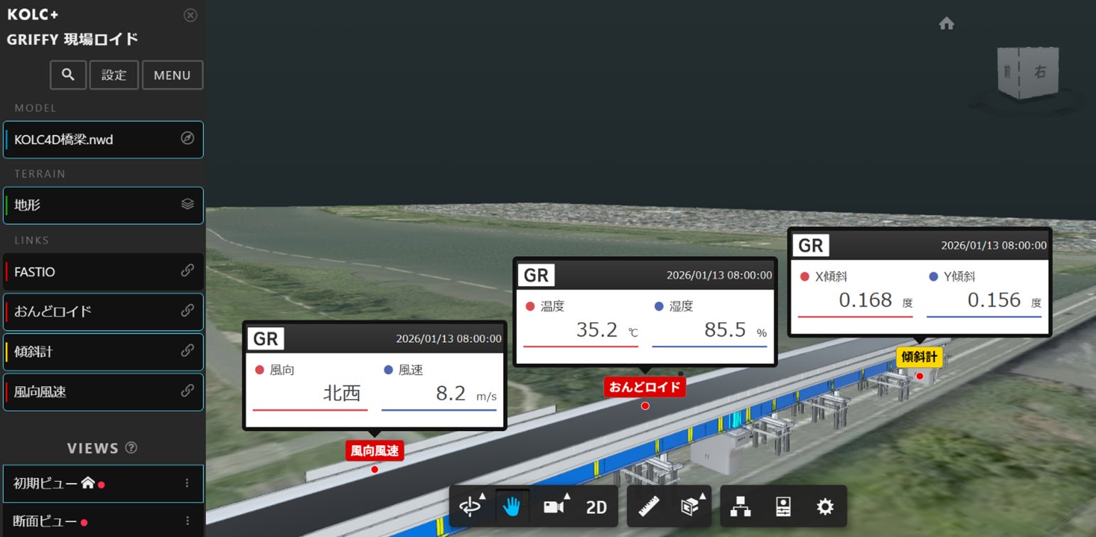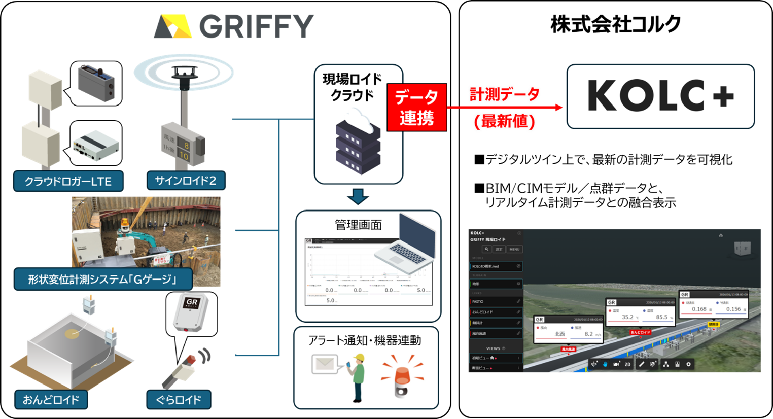 株式会社GRIFFY(本社:東京都千代田区、代表取締役 入澤 拓也、以下「GRIFFY」)は、2026年1月よりGRIFFYが提供する「現場ロイドクラウド」上に収集した計測データを、株式会社コルク(本社:東京都豊島区、代表取締役 堤 正雄)が提供するBIM/CIMクラウド「KOLC+」と連携し、デジタルツイン上に計測データのサマリーを一元表示可能になったことをお知らせいたします。