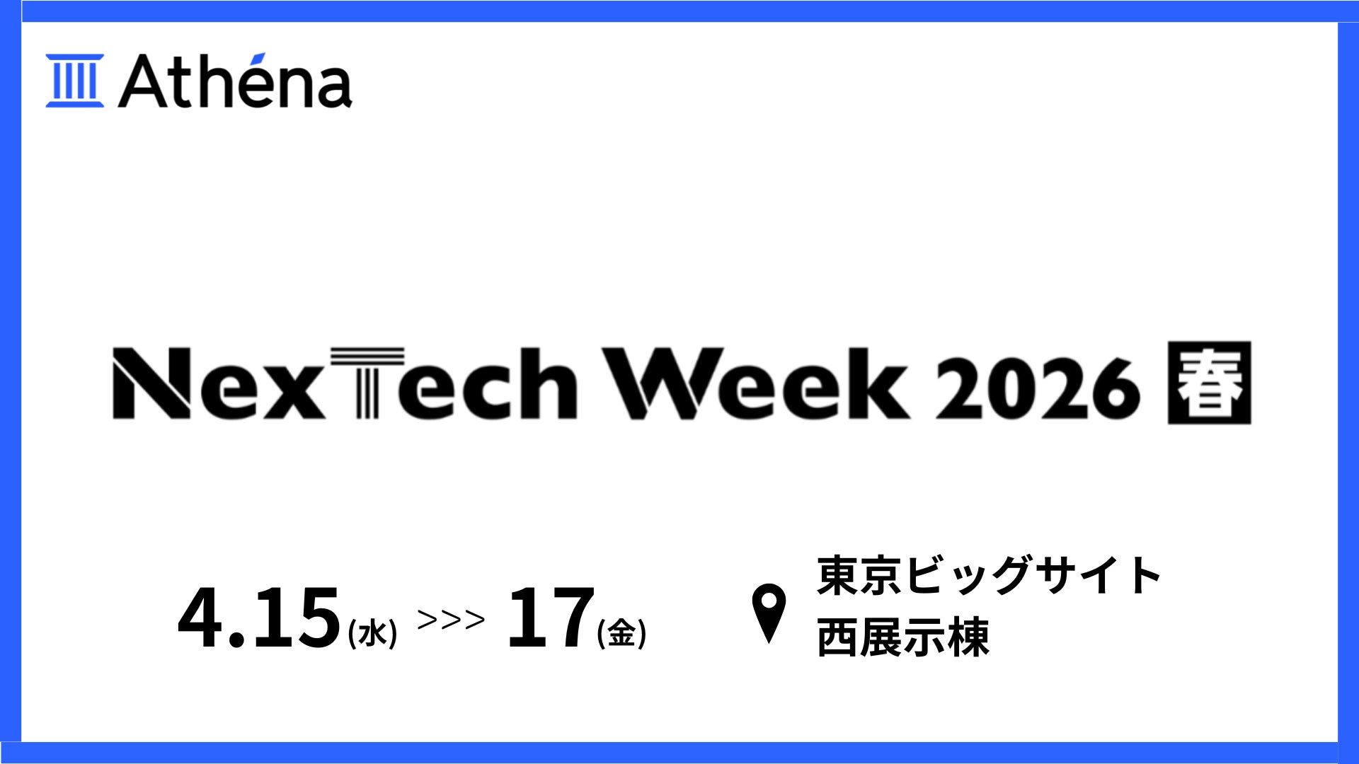 株式会社Athena Technologies(本社:東京都文京区、代表取締役:阿部 武、以下、「 Athena」)は、2026年4月15日(水)〜17日(金)に東京ビッグサイトで開催される「NexTech Week 2026【春】」 に出展いたします。