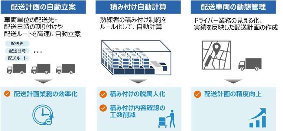 配送計画の自動立案や荷物の積み付け方法の自動算出機能などで、業務の脱属人化・効率化や、ドライバー不足の改善への貢献を目指す