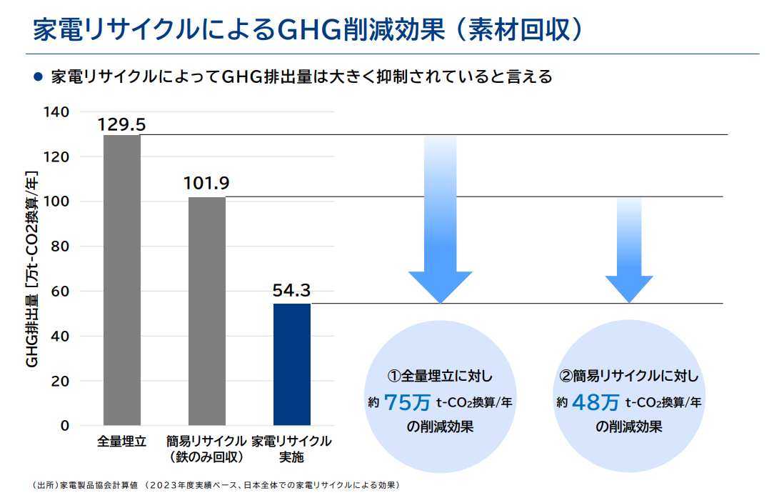家電リサイクルを実施している現状ケース(素材を回収して再利用)と仮に実施せずに全量を埋め立てたと仮定したケース(同量分の素材を新たに採掘、生産)とを比較した場合の素材由来による削減効果は約75万t-CO2換算/年ありました。