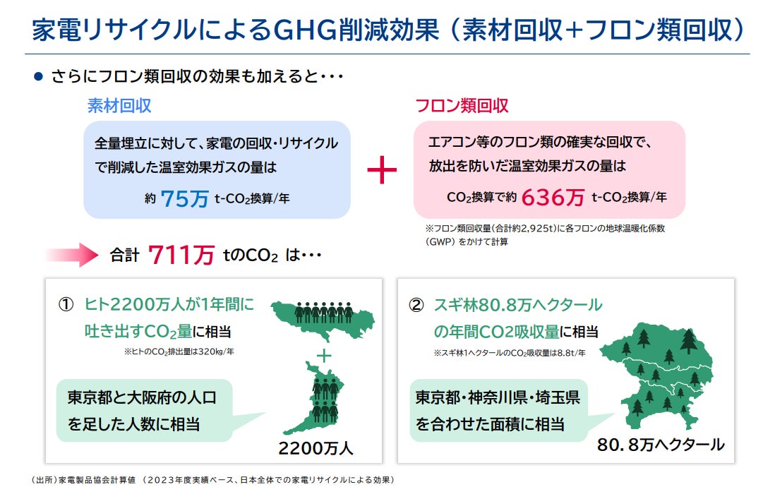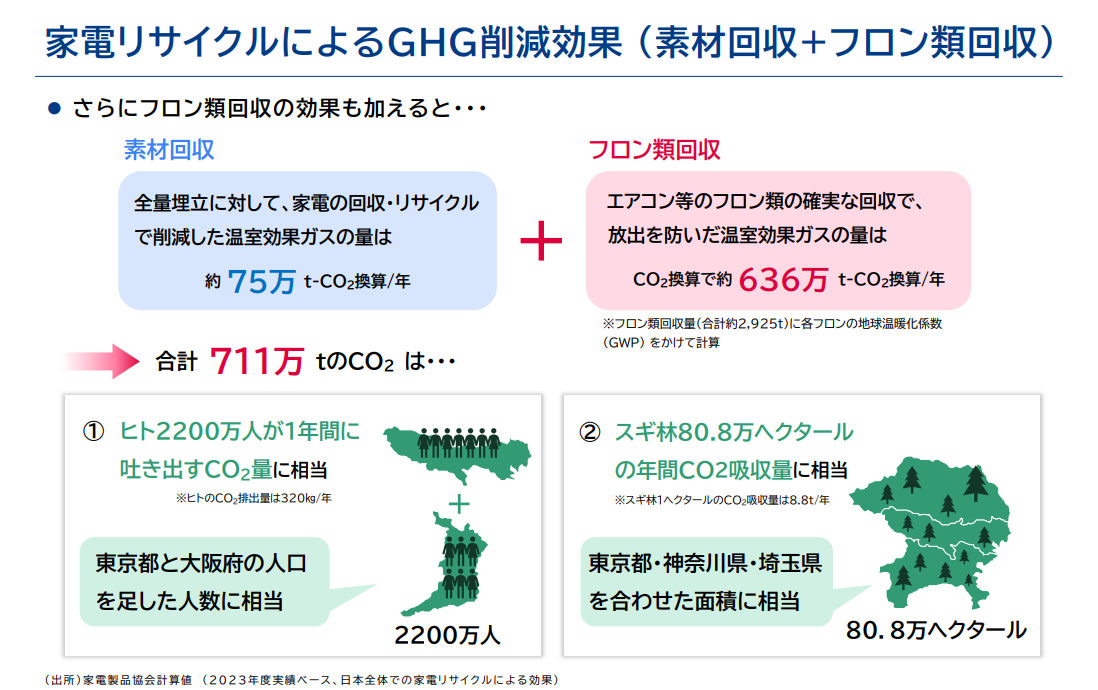 更に家電リサイクルの工程では製品に使用されている温室効果ガスであるフロン類も全量回収していますので、その大気放出を防いだ総量はCO2換算で約636万t-CO2換算/年あり、それらを合計した家電リサイクルによるGHG削減効果総量は約711万t-CO2換算/年となりました。