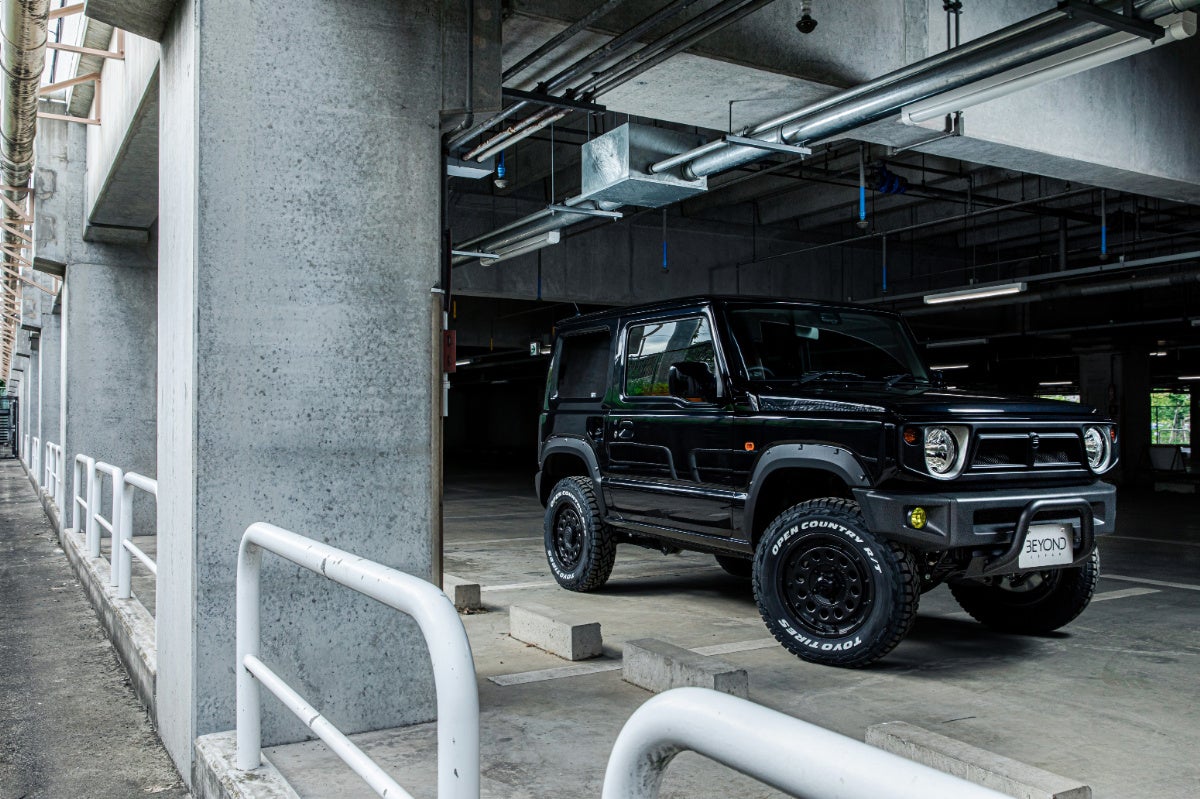 ジムニーのフロントを大胆にショート化。オフロード性能を際立たせ、Tr27との相性も抜群。力強さと洗練を両立したデザインです。