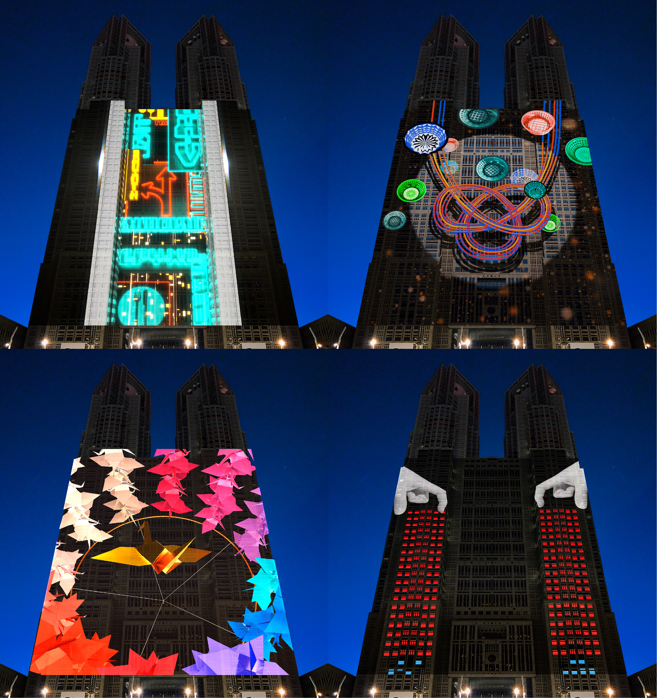 都庁舎の幾何学的な美しさを江戸切子や水引などの伝統工芸と重ね合わせ、日本の「型」の美学を映像で表現した作品