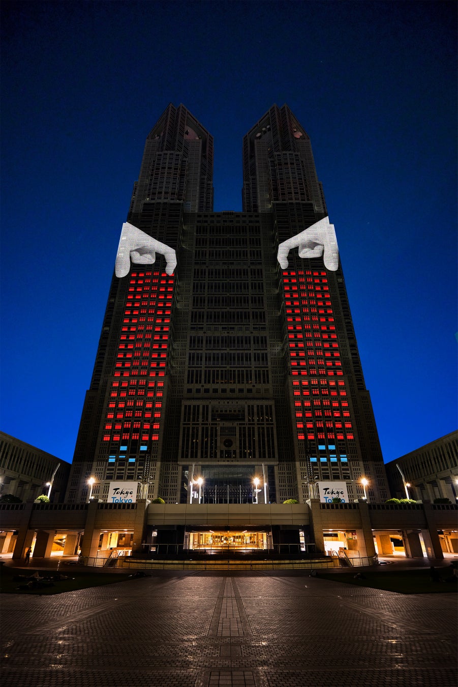 都庁舎の巨⼤な垂直構造を、地下深くから宇宙へと繋げる軌道エレベーターに⾒⽴てた作品