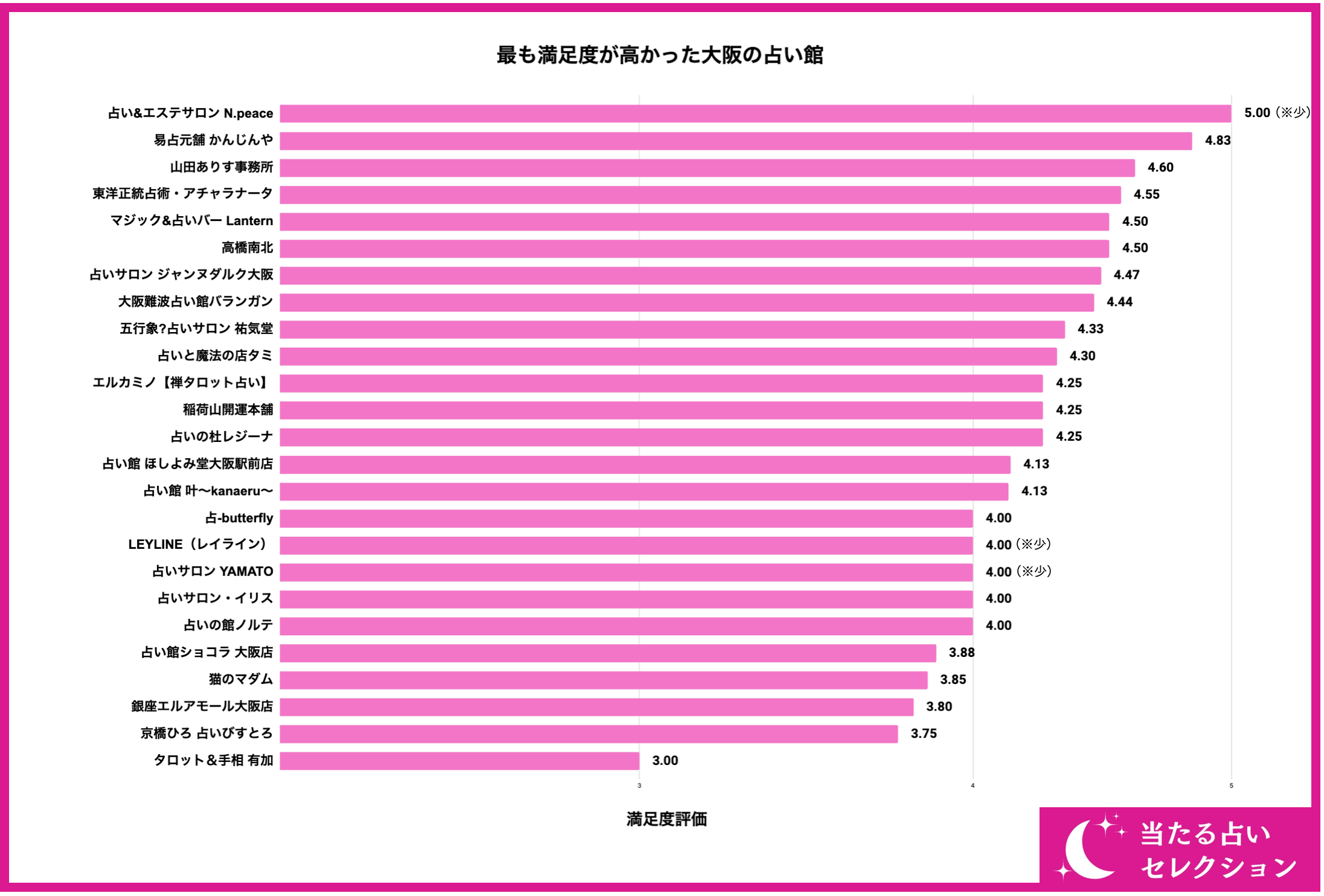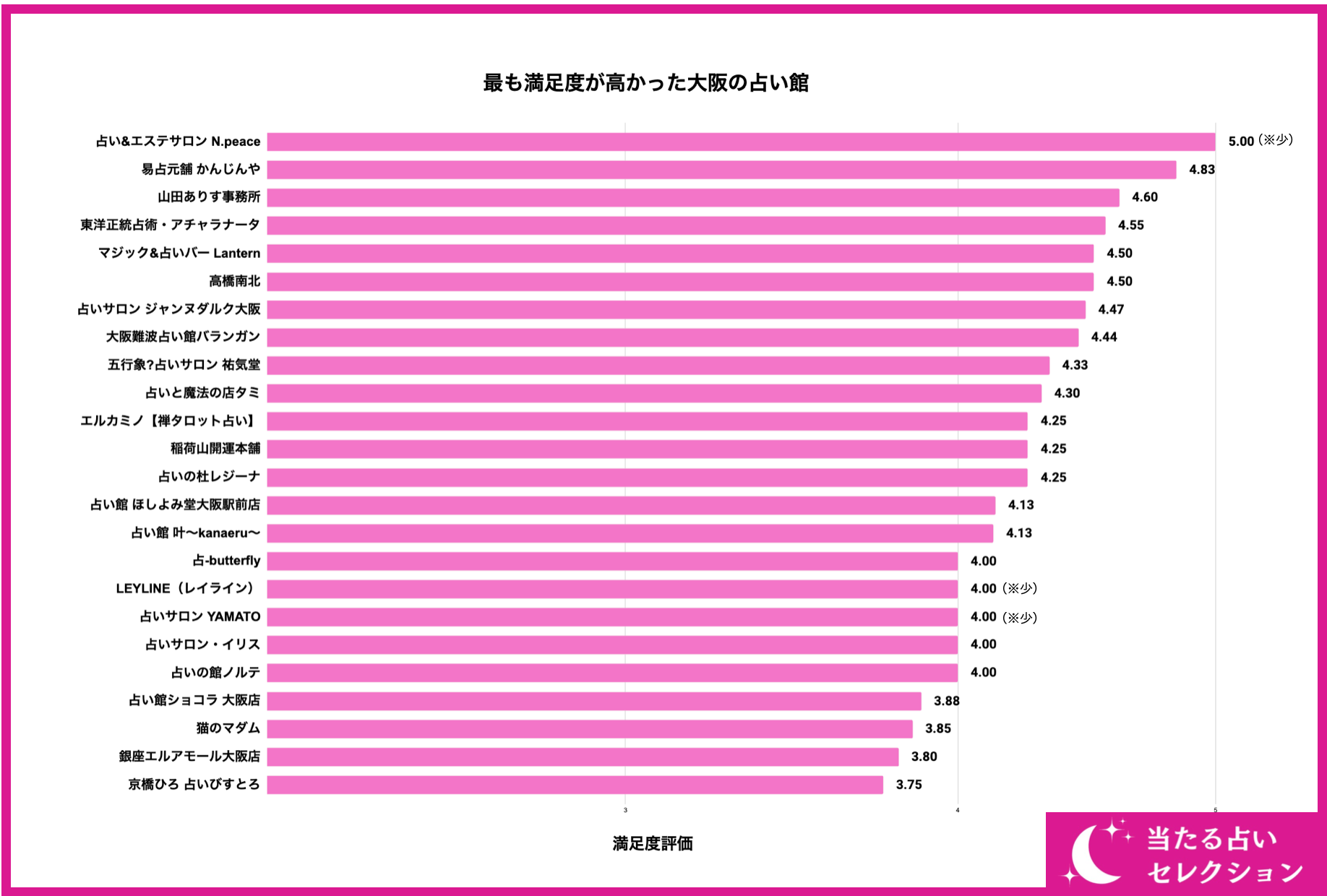 続いて、大阪の占い店舗の中で最も満足度評価が高かったのはどの占い店舗でしょうか?結論から言うと、画像の通り「占い&エステサロン N.peace」が満足度評価「5.00/5.00」で最も評価が高いことが分かりました。さらに全体的に低評価も少なく、多くの人が大阪の占い店舗に満足していることが分かりました。