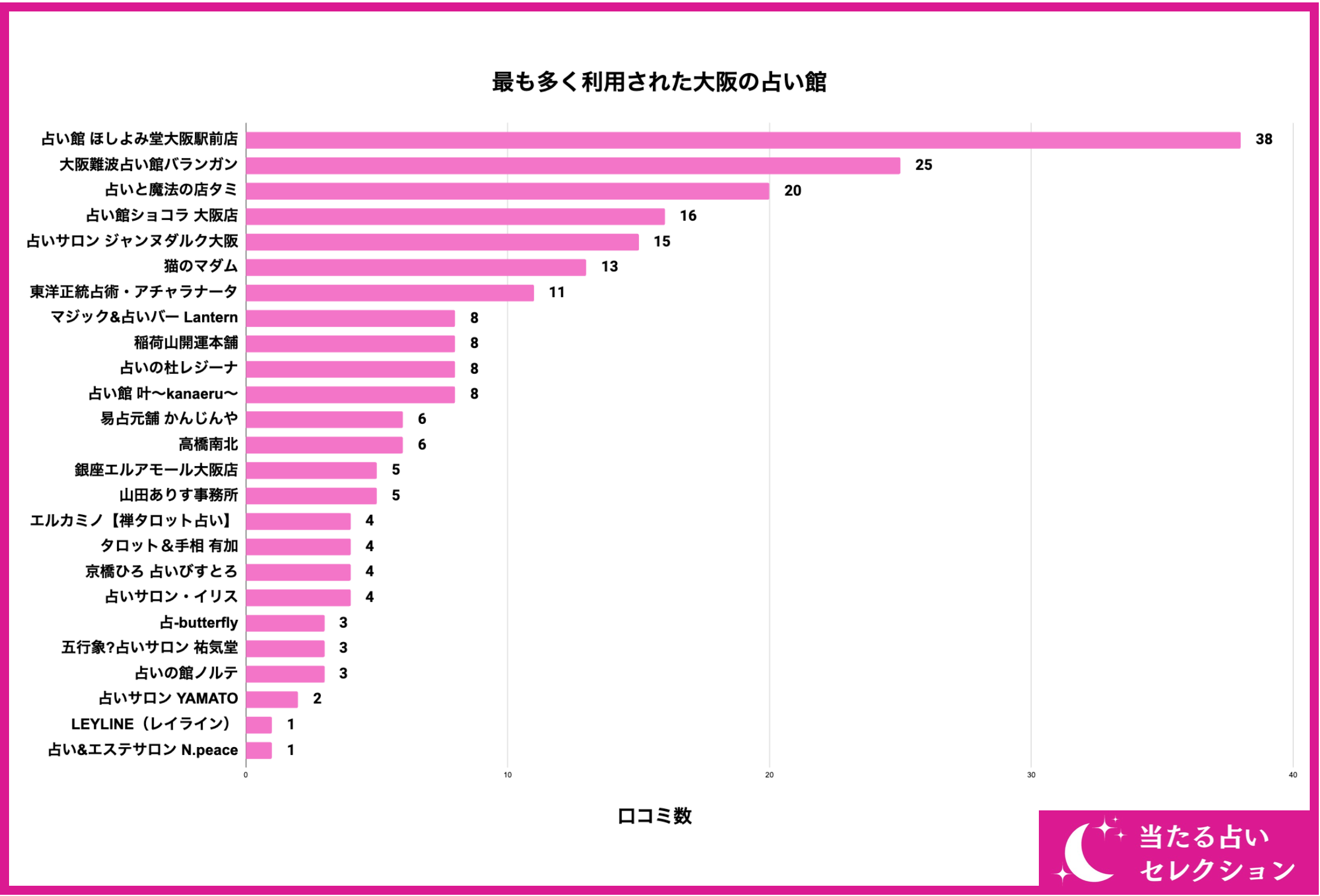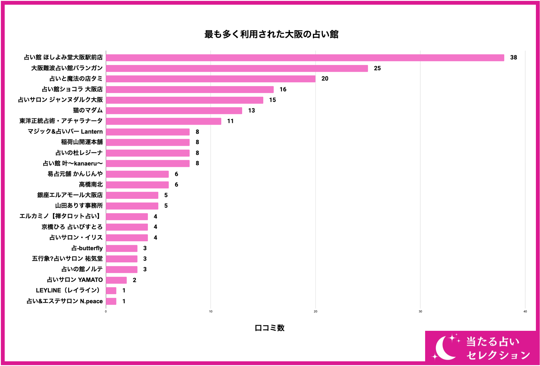 続いて、221名の利用者のうち最も多く利用された大阪の占い店舗をご紹介していきます。結論から言うと、「占い館 ほしよみ堂大阪駅前店」や「大阪難波占い館バランガン」といった有名な占い店舗が上位となりました。口コミ数が多い占い店舗は、色々な記事や特集で見ることも多く、認知度や知名度が高いため利用者数も多くなっていることが考えられます。さらに立地がいい点も口コミ数、来店数に影響しているかと思われます。