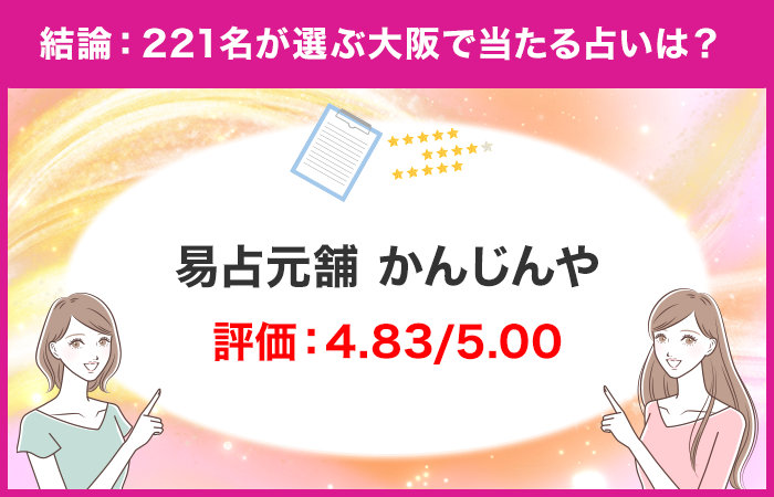 221名の独自アンケートの結果、ユーザーが選ぶ大阪でおすすめの占い店舗、第1位は「易占元舗 かんじんや」となりました。満足度評価「4.83/5.00」とユーザーからの評価が高く、「易占元舗 かんじんや」の実力が高いことを証明していると言えるでしょう。