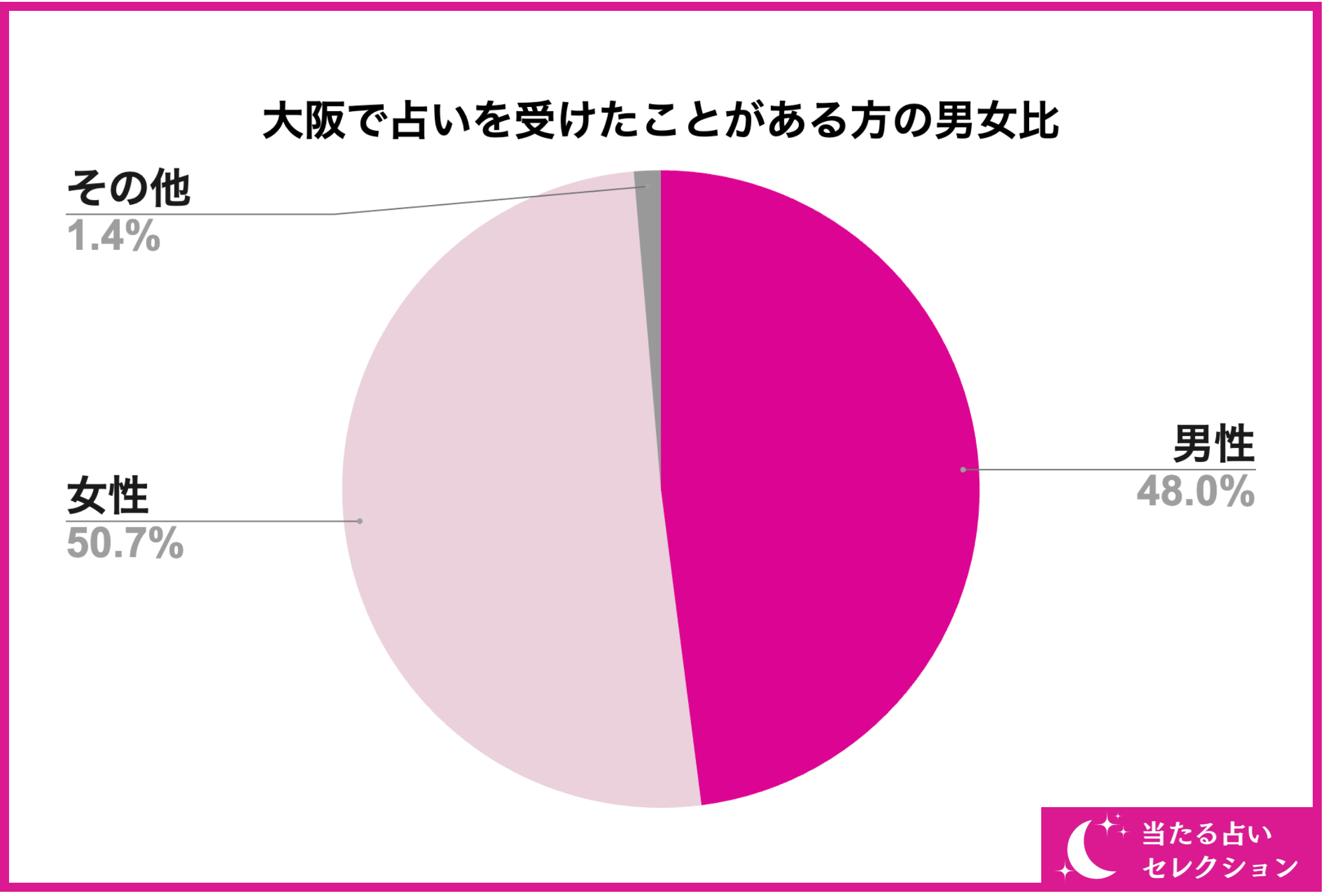 まず初めに、大阪で占いを受けたことがある方の男女比についてご紹介していきます。大阪で占いを受けたことがある男女の比率は画像の通り、男性が約48%、女性が約50%の結果となりました。占いを利用する人は女性が多数というイメージを持っている方も多いかと思いますが、実際も約50%(半分)が女性という結果になりました。