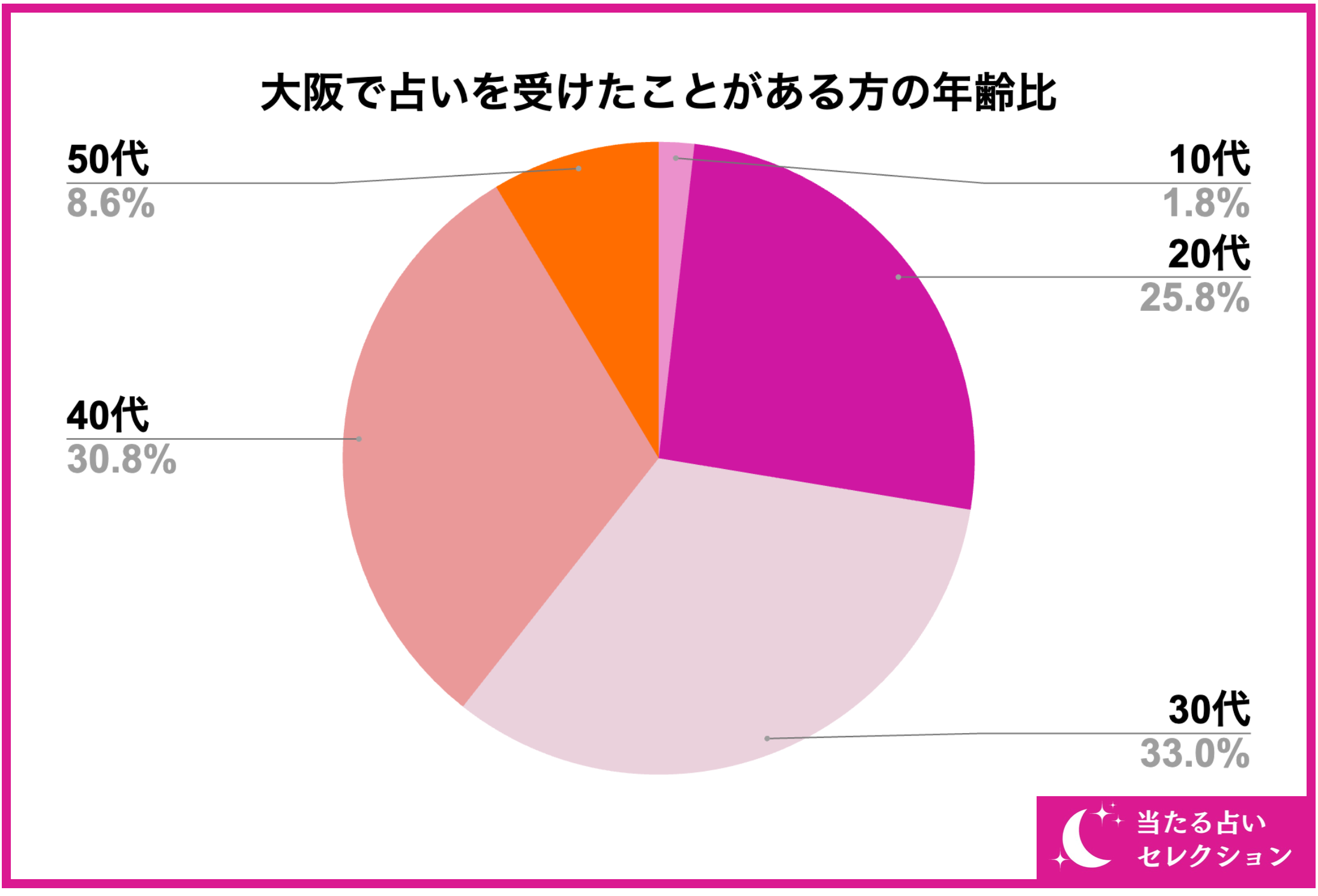続いて、大阪で占いを受けたことがある方の年齢比率ですが、画像の通り、20代〜40代がメインとなっています。中でも、30代の利用者数が全体の33%と多くなっています。30代になると使えるお金が多くなったり、悩み事も増えてくるため占い師にお願いする人が増えるのかもしれません。