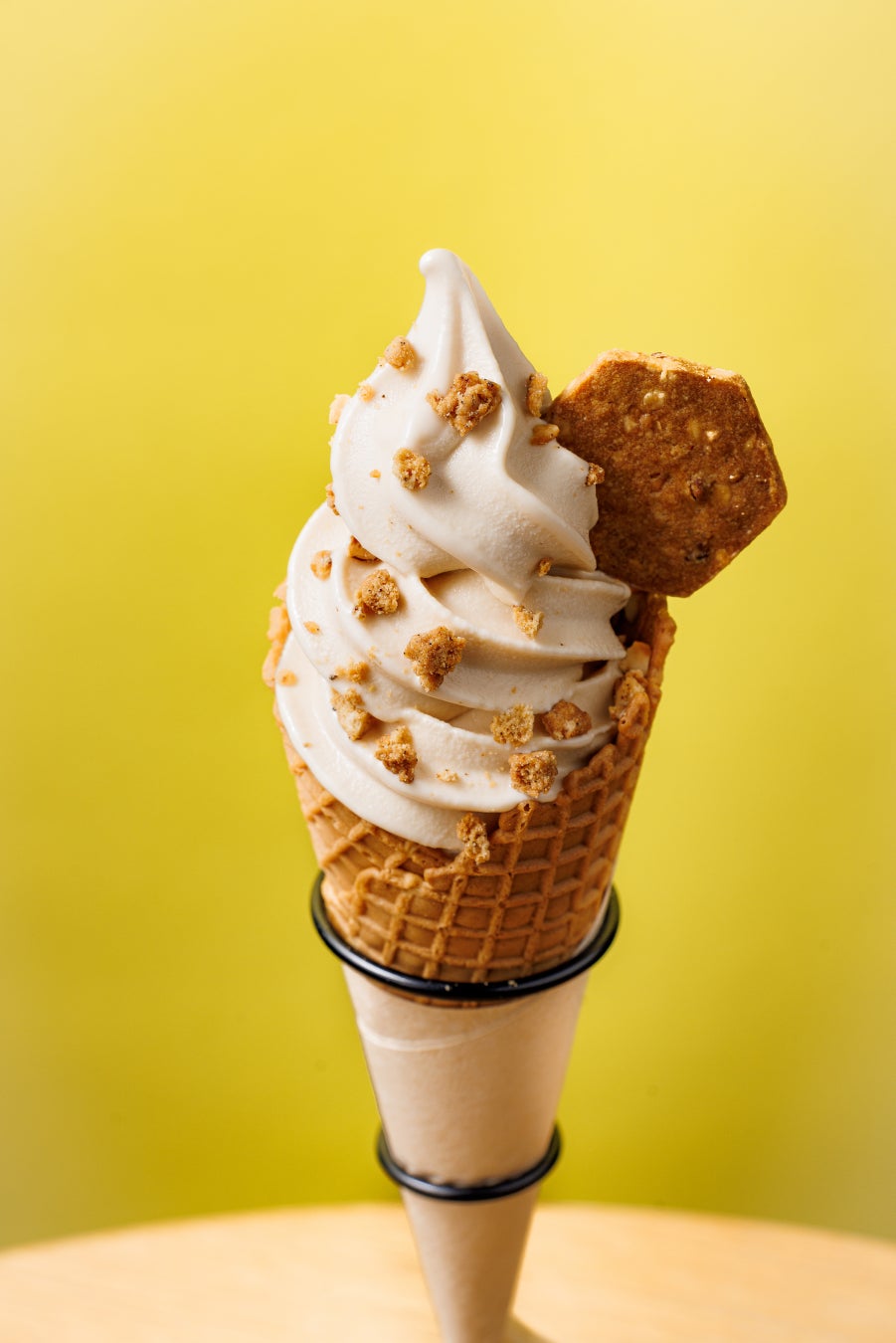 「ル・ビスキュイ・アラン・デュカス」で人気のバターの風味たっぷりのビスケット「ピュール・ブール」がソフトクリームに!仕上げには、クランブルのようなザクザク食感が楽しいビスケット「スブリ」とヘーゼルナッツのビスケットをトッピングして食感のアクセントに。ミルクのくちどけに香ばしいバターの風味が広がります。