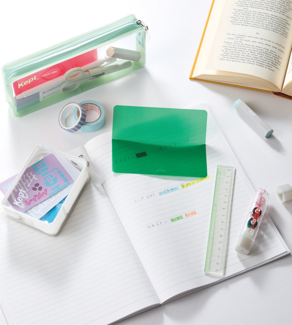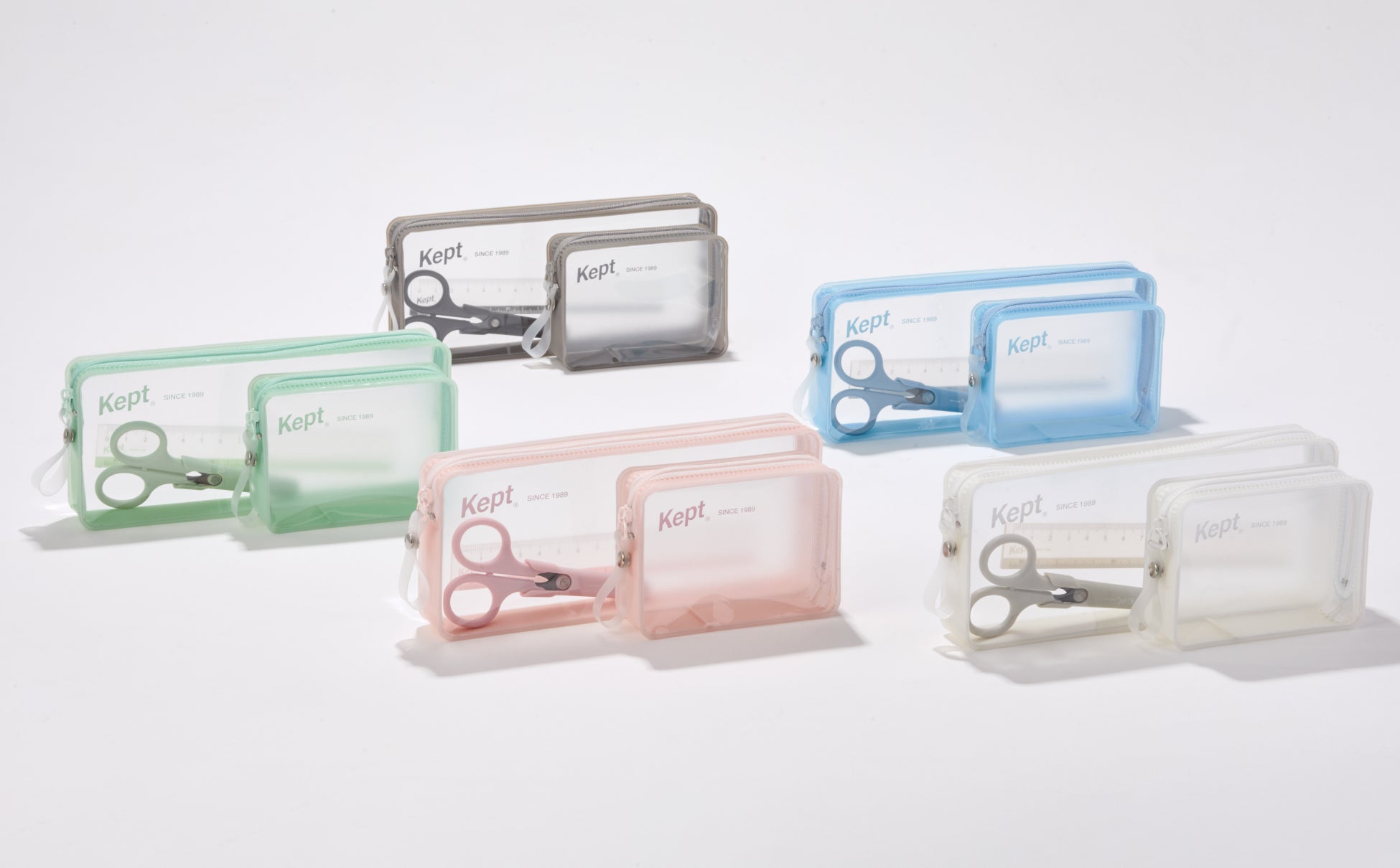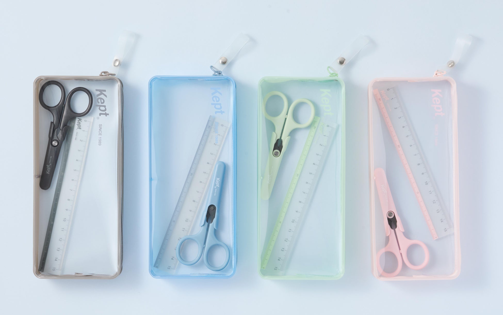 文房具ブランド「kept」より、シンプル&スマートに収納ができて自立するペンケース「レクトペンケース」「レクトカードポーチ」、消しゴムで消せるラインマーカー「キエラ」、ペンケースに入る暗記シート、人気のハサミと定規の新色を発売します。
