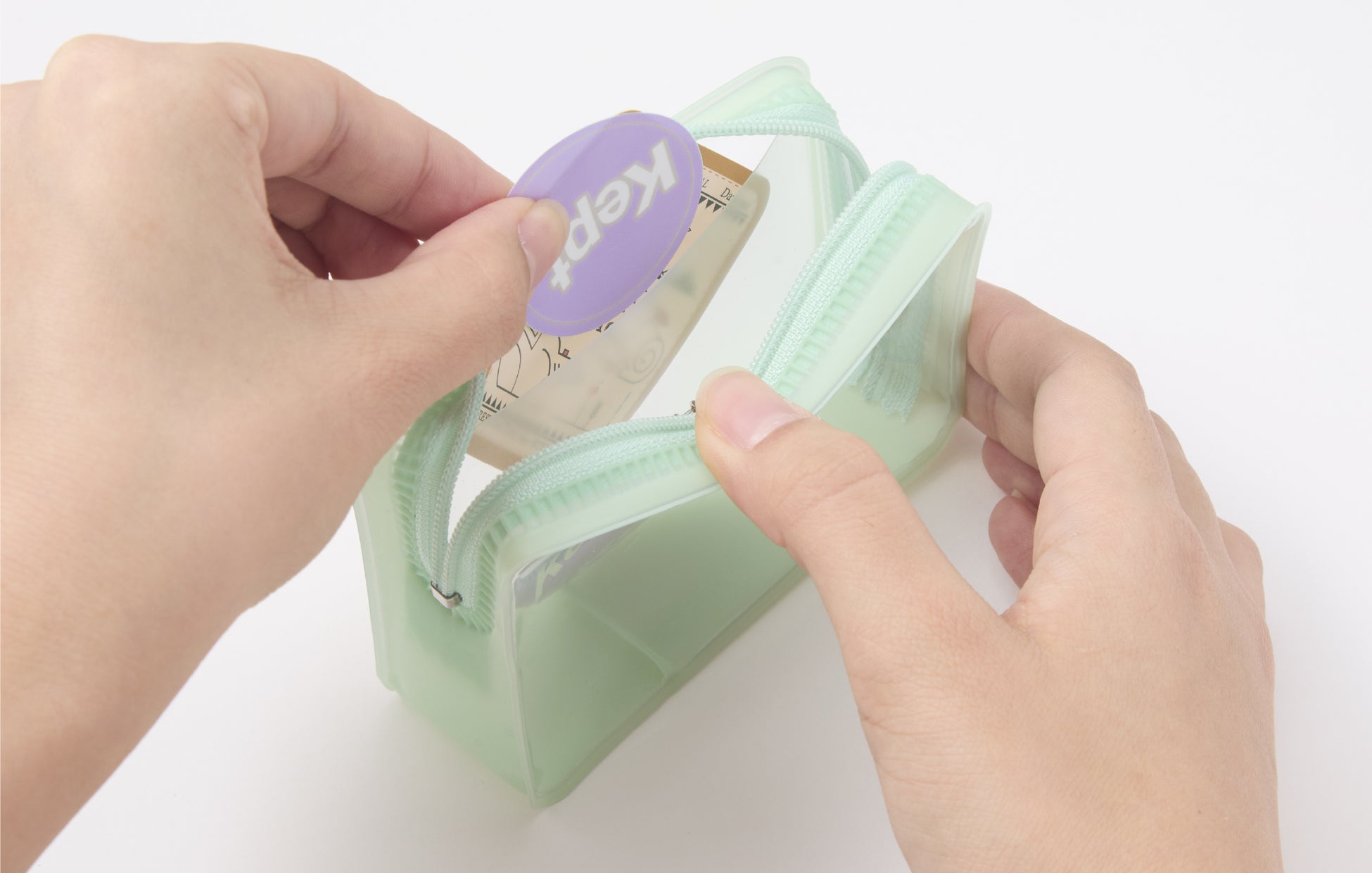 シンプルな直方体の形状。薄型でありながら、しっかり自立します。側面にカラーを施し、正面はクリア、背面は半透明の内ポケットが付いているので中に入れたものが映えて見えます。コの字型のファスナーなので出し入れもしやすく、透明なので必要なものがすぐ取り出せます。