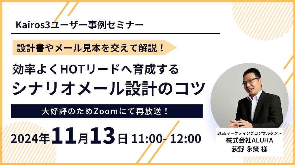 売上アップを仕組みで実現するCRM「Kairos3(カイロススリー)」を提供するカイロスマーケティング株式会社(本社:東京都渋谷区、代表取締役:佐宗 大介、以下「当社」)は、2024年8月に実施したオンラインセミナー「設計書やメール見本を交えて解説!効率よくHOTリードへ育成するシナリオメール設計のコツ」が好評だったことを受け、2024年11月13日(水)に再配信することを決定いたしました。