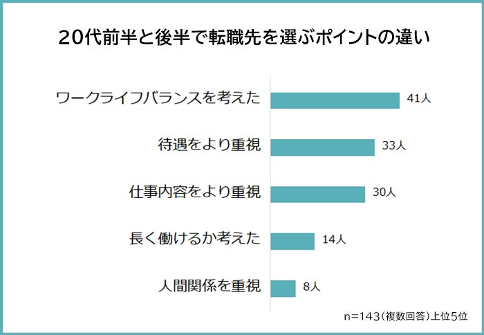 最後に、「20代前半と後半での転職先を選ぶポイントの違い」を聞きました。その結果、1位は「ワークライフバランスを考えた(41人)」、2位は2位「待遇をより重視(33人)」となりました。