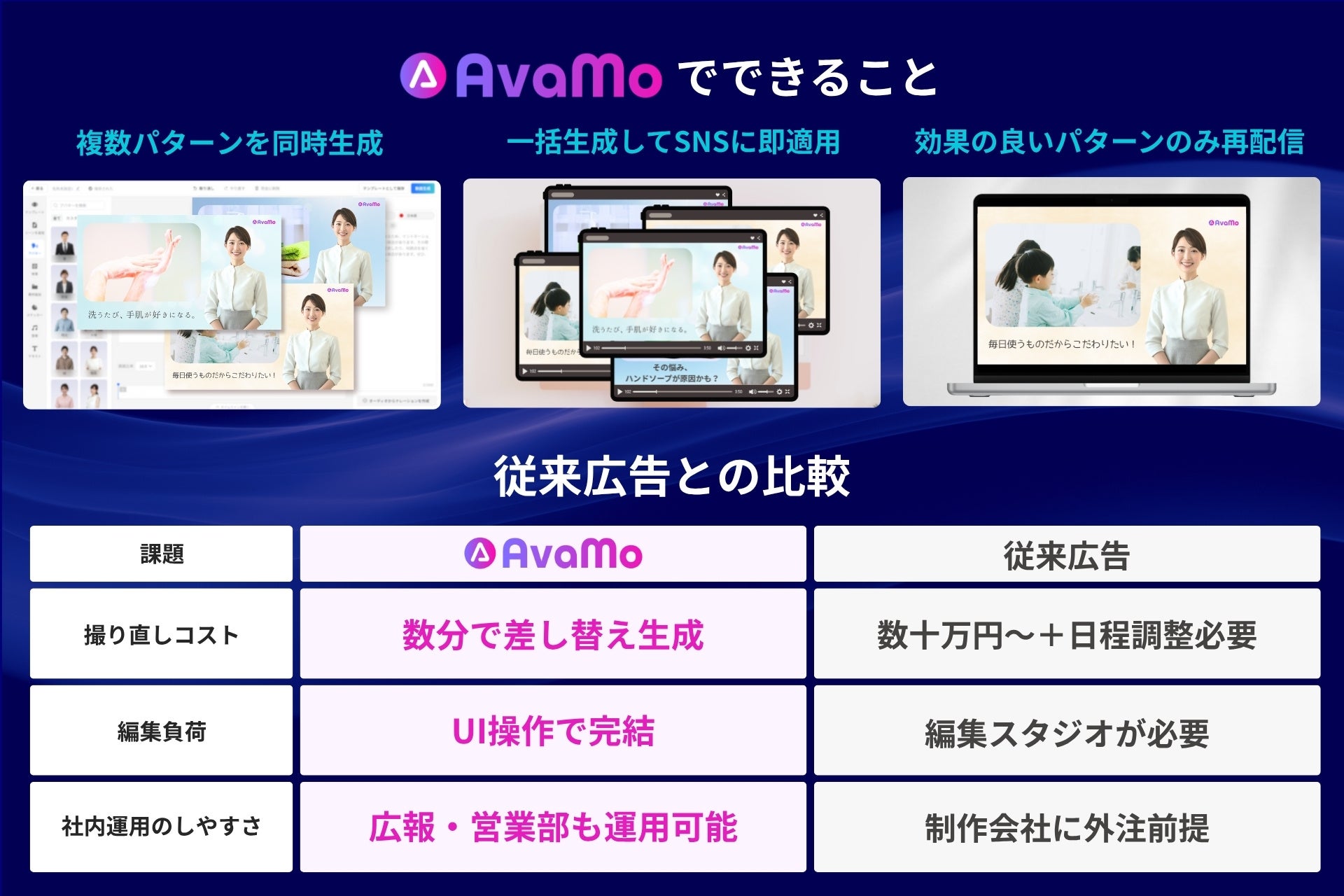 従来の動画広告制作は、企画・キャスティング・撮影・編集・納品・効果検証といった工程が分断され、クリエイティブの改善には多大なコストと時間がかかる非効率な構造にありました。「AvaMo」は、“AIタレント”を用いて動画広告のPDCAを高速で回せる、全く新しい広告運用モデルを実現いたします。