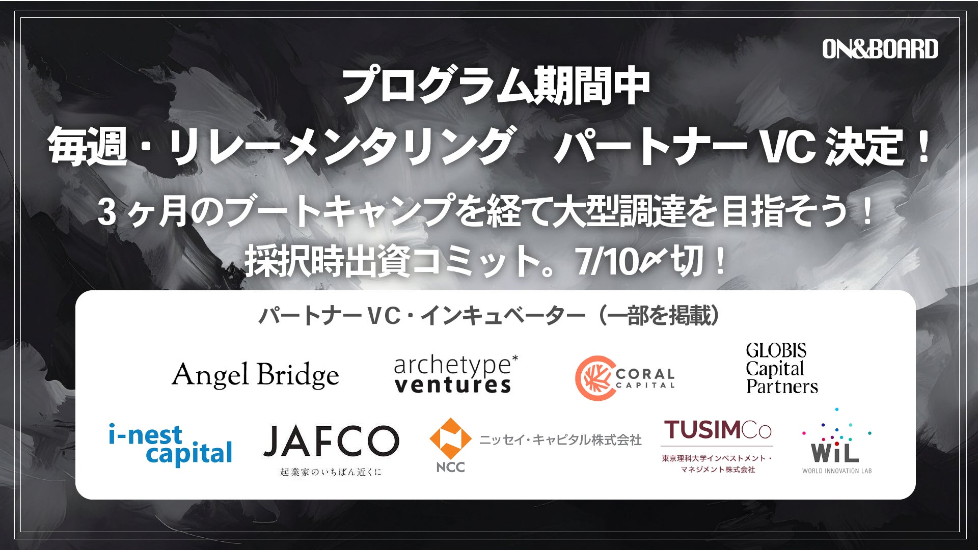 ON&BOARD株式会社(所在地:東京都港区虎ノ門、代表取締役:下平将人、中山航介 以下「当社」)は、第3期創業支援プログラム「Out of BOUNDS」において、新たにパートナーVC・インキュベーターによる週次でのリレーメンタリングセッションを実施することを決定しましたのでお知らせいたします。現在、本プログラムでは参加起業家の募集を受付中であり、採択された起業家には当社からの出資をコミットさせて頂きます。参加起業家のみなさまへこれまで以上に濃密なハンズオン支援を提供し、事業仮説の検証から成長加速までを強力に後押ししてまいります。ぜひ本プログラムに参加の上、あなたの眠れる可能性を解き放ちましょう!