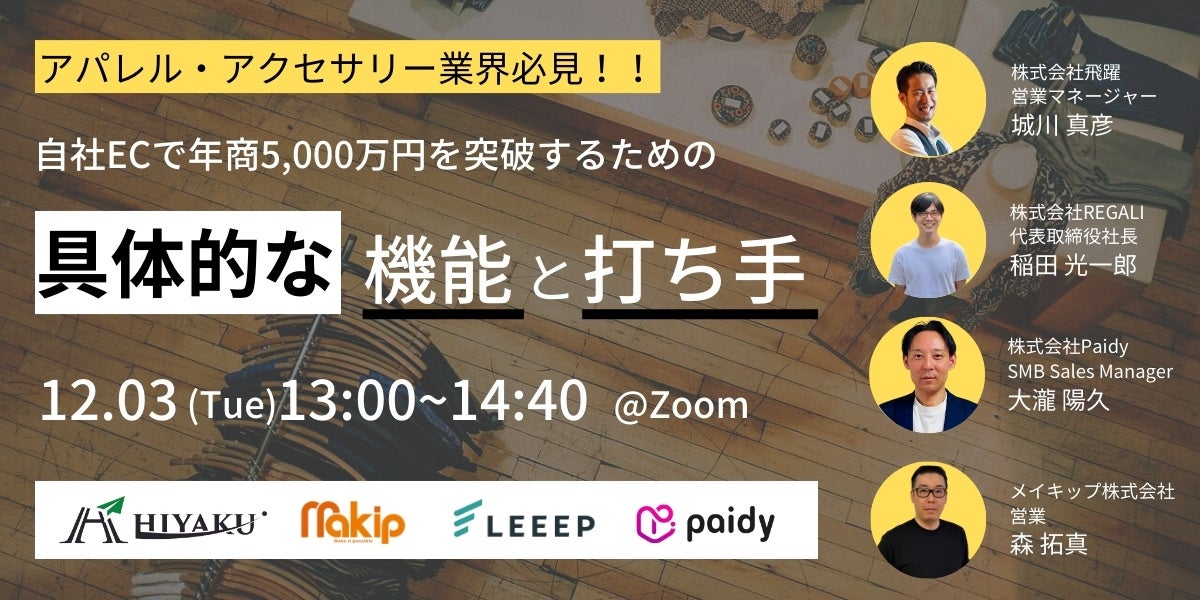 12/3(火) 13:00~ アパレル/アクセサリーECで年商5000万円を突破するための具体的な機能と打ち手を解説します。