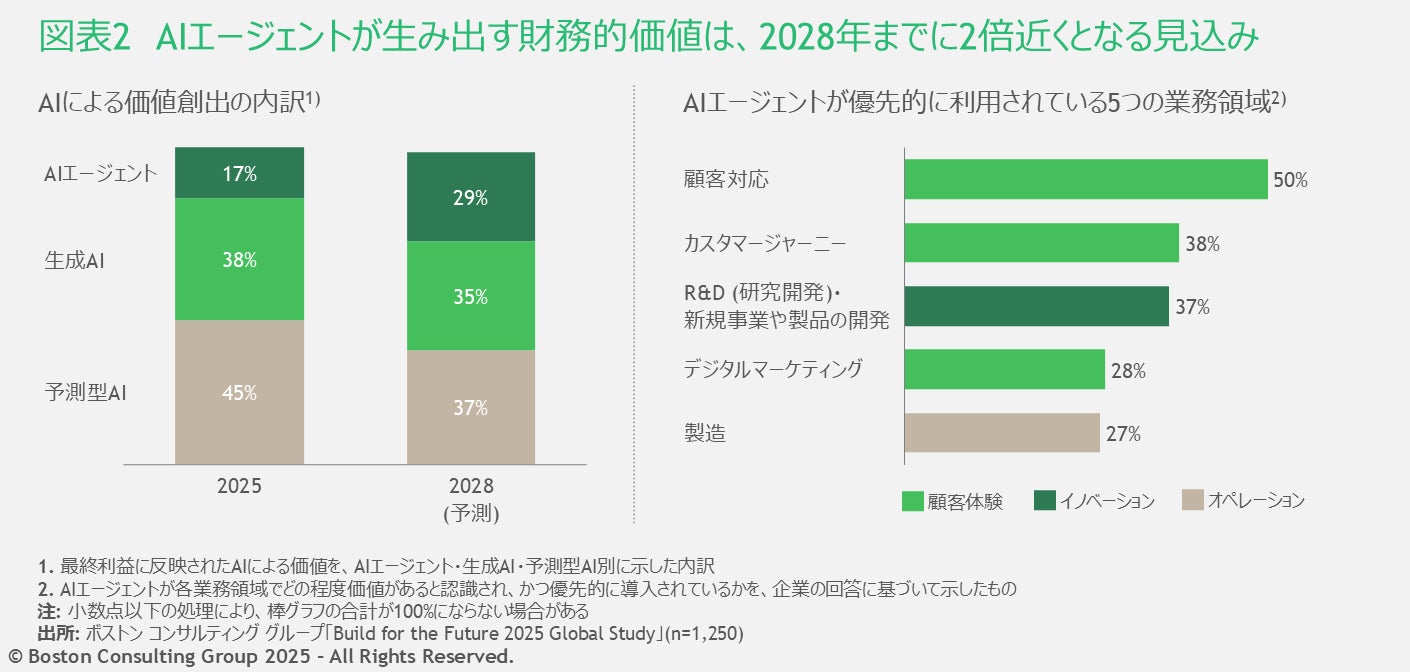 企業がAIで生み出している価値に大きな差が生まれている理由の一つが、AIエージェントの台頭です。AIエージェントは、学習、推論、意思決定、実行を自律的に行い、複雑かついくつもの工程が必要な課題を解決できます。調査によると、AIエージェントが生み出す財務的価値は、2025年時点ですでにAIが生み出している価値全体の17%を占めており、この割合は2028年までに29%へと増加する見込みです(図表2)。