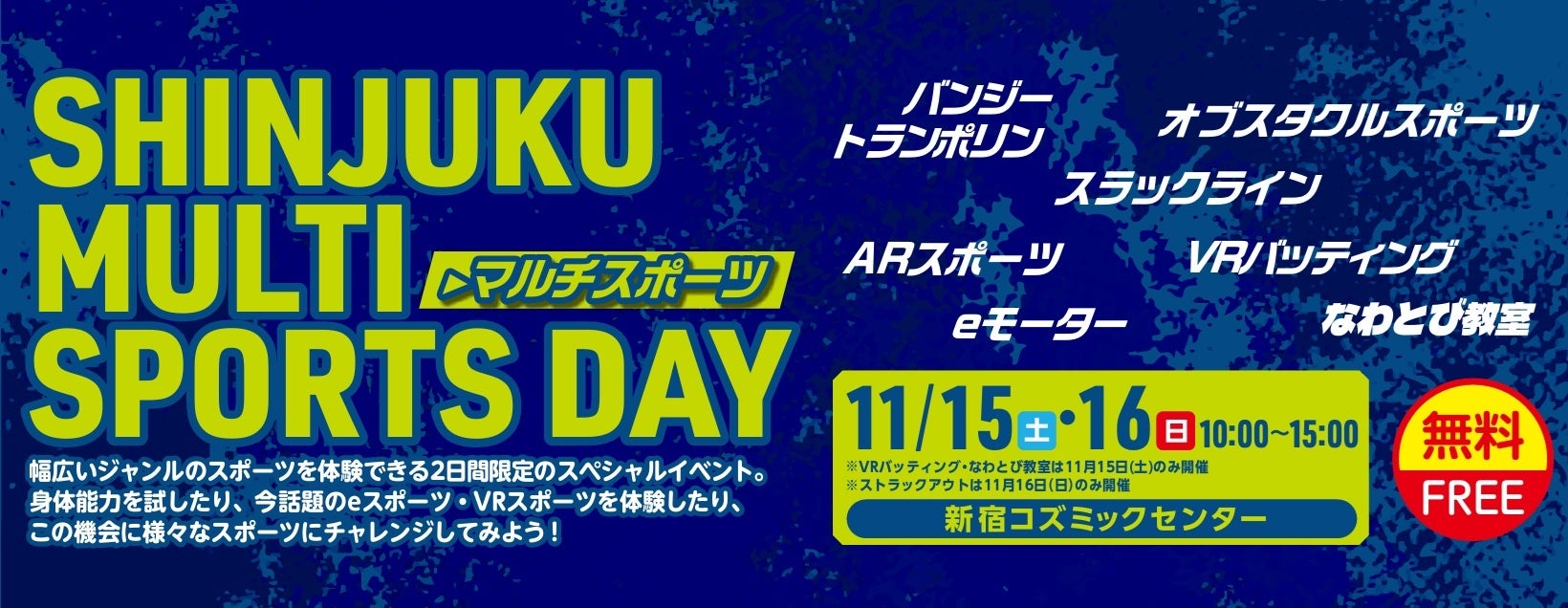 11月15日(土)・16日(日)に、幅広いジャンルのスポーツを体験できるイベント「SHINJUKU MULTI SPORTS DAY(新宿マルチスポーツデー)」を開催します。身体能力を試したり、今話題のeスポーツ・VRスポーツを体験したり、この機会に様々なスポーツにチャレンジしてみよう!