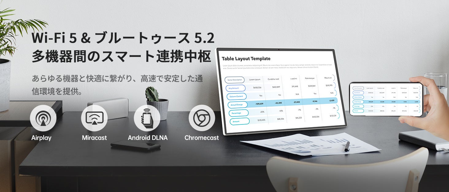 Wi-Fi 5 & Bluetooth 5.1を内蔵し、お手持ちのスマートフォン、タブレット、ノートPCとのワイヤレス接続は瞬時。Type-Cポートでは給電と映像伝送を同時に行えるため、ノートPCのサブディスプレイとしても、スマホの大画面ミラーリングとしても、ケーブル1本で簡単セットアップ。エンタメも仕事も、この1台で可能性が無限に広がります。
