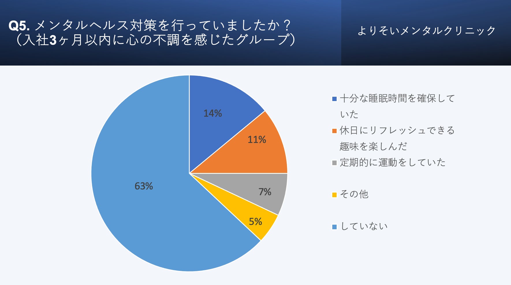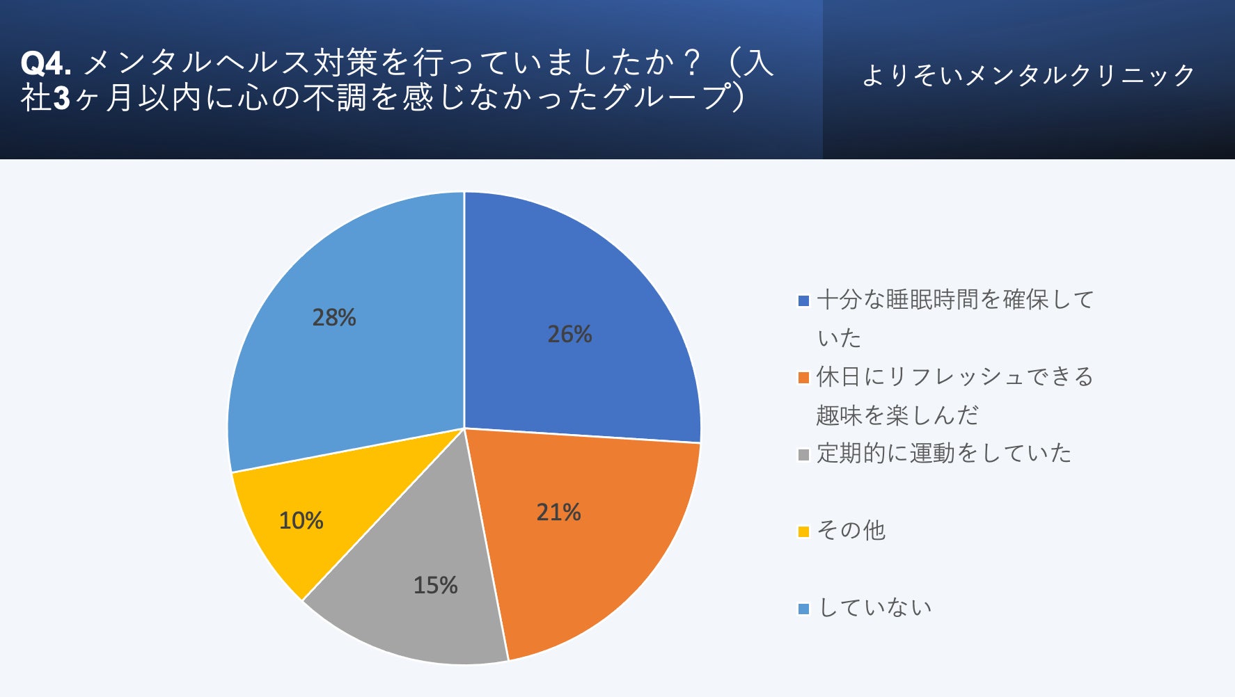 その結果、「十分な睡眠」や「休日のリフレッシュ」など約7割の方がメンタルヘルス対策をしていることが分かりました。