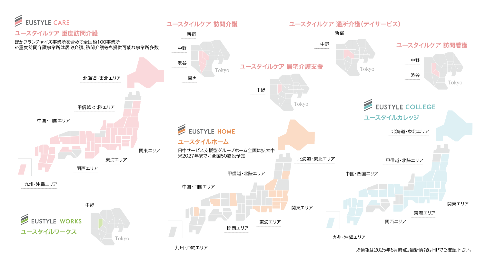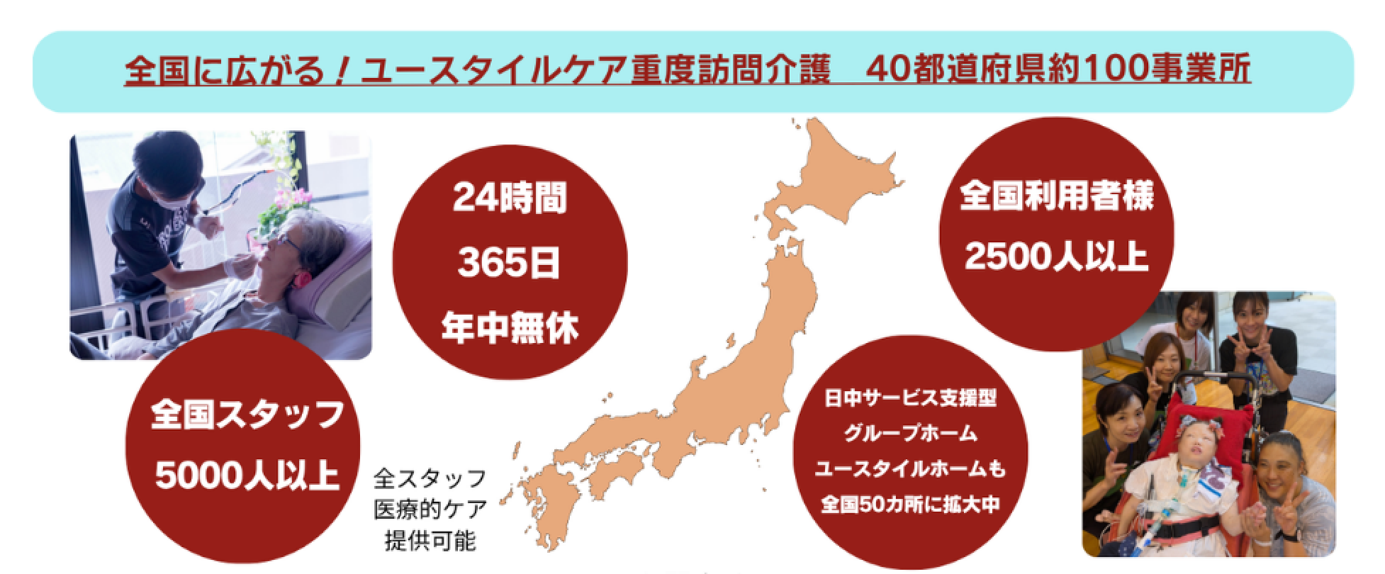 特に、障害福祉分野においては国内最大規模の障害者向け重度訪問介護事業者として、全国にサービスを広げています。 今後も全国各地に新規事業所・新規事業を展開し、日本の介護に関わるあらゆる課題解決に挑戦してまいります。