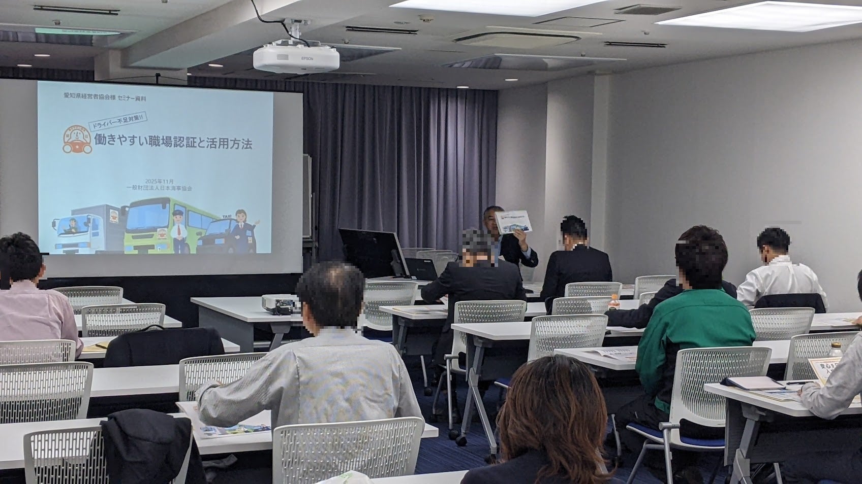 2025年11月10日、「働きやすい職場認証制度」事務局は、愛知県経営者協会の運輸部会例会に招かれ、制度の説明を行いました。