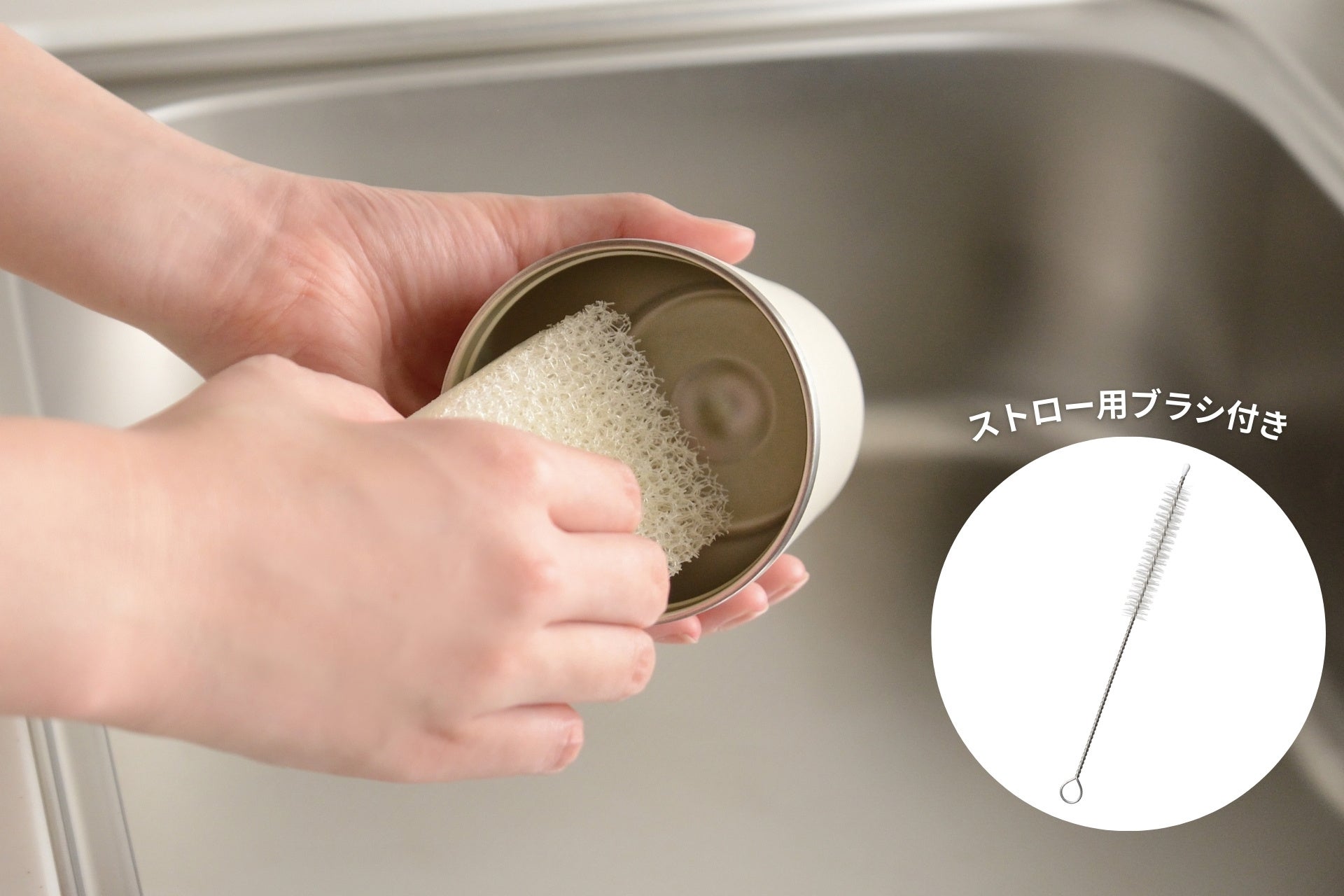 口が広いのでお手入れもらくらく。普段お使いのスポンジで底までしっかり洗えます。ストローを洗う専用ブラシも付いているので安心です。
