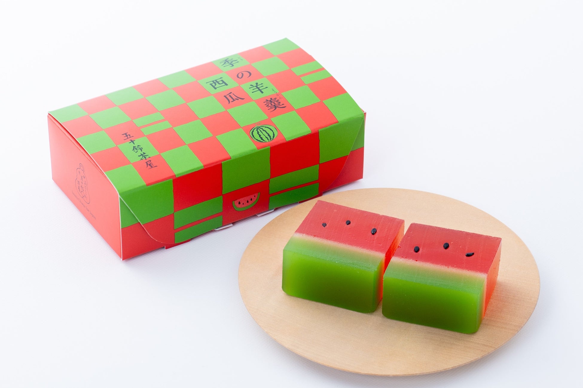 夏の風物詩スイカを三層の羊羹で表現しました。 スイカの風味広がる可愛らしい羊羹です。