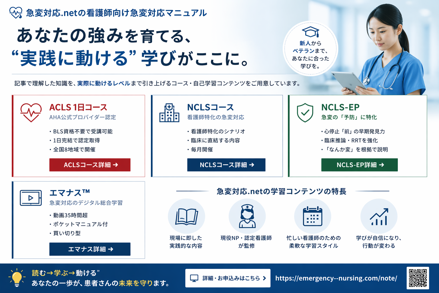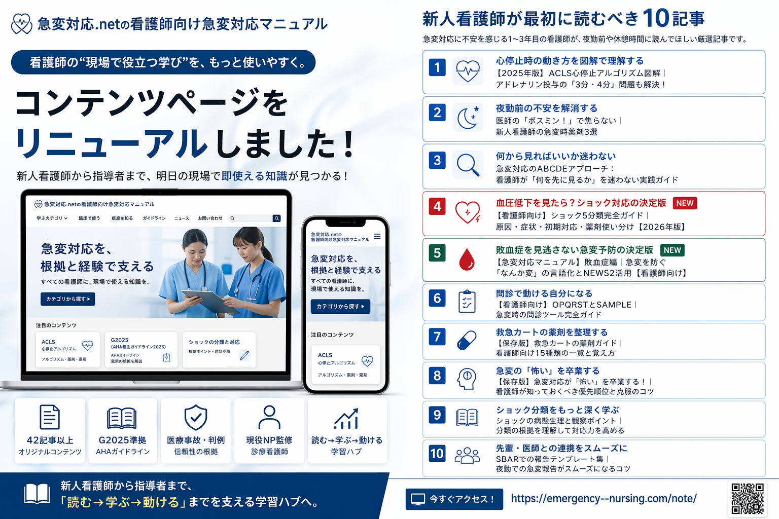 「急変対応.net、診療看護師(NP)監修の保存版|看護師向け急変対応マニュアルを全面リニューアル ─ 41記事を新人看護師〜教育担当者向けに体系化、 ガイドライン2025完全対応で無料公開」