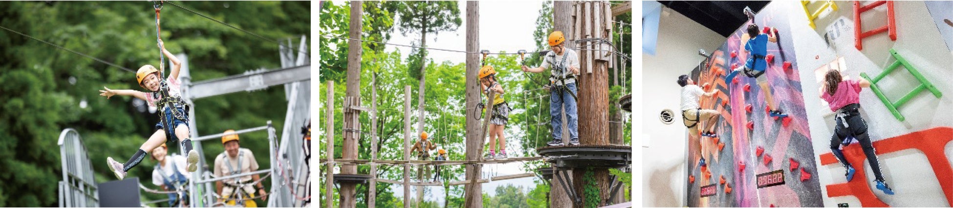 ②ツリーアドベンチャー: 森の中の本格アスレチック。最⼤ 9m の⾼さを誇り、冒険気分を味わえる
