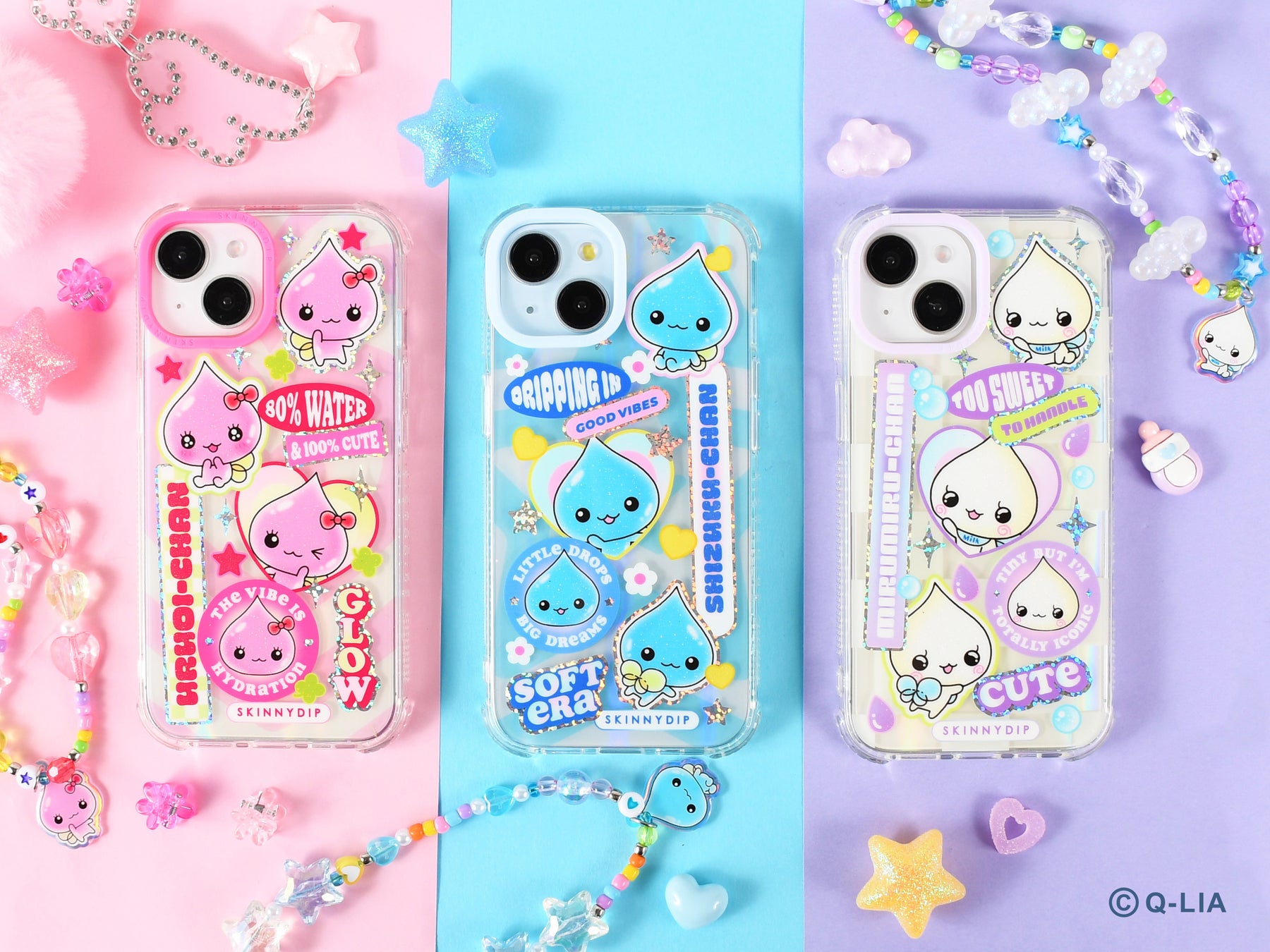 キラキラなグリッターとギラギラな大きめなホログラムで、しずくちゃん達のシールを貼り付けたようなポップで遊び心あふれるフォンケースをはじめ、SKINNYDIPらしさ全開のアイテムラインナップです。