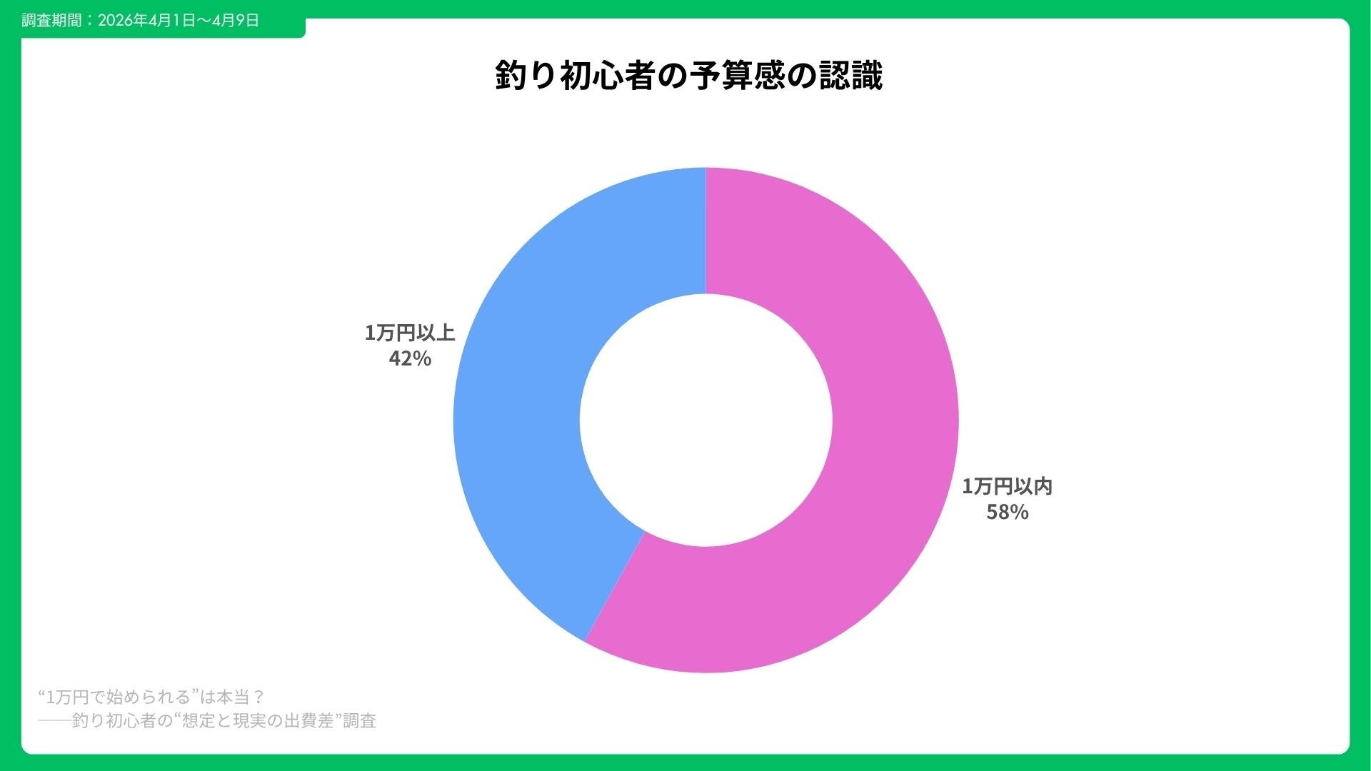 釣りを始める前に想定していた初期費用について調査したところ、「1万円以内で始められると思っていた」と回答した人は 58% にのぼった。平均想定額は¥11,200、中央値は¥10,000となり、“1万円前後で始められる”という認識が主流であることが分かる。
