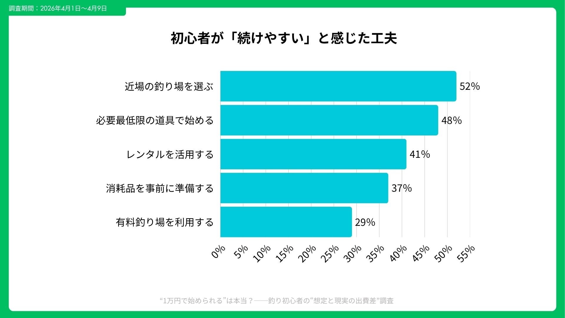 さらに今回の調査では、初回から高額な道具をそろえるよりも、「必要なものだけで始める」ほうが満足度と継続意向の両方につながりやすいことが分かった。釣果が出なくても納得しやすい費用感に抑えることが、続けやすさに直結している。