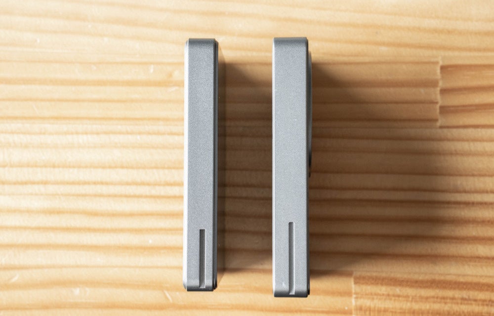 で、このモバイルバッテリーは5,000mAhモデルと、10,000mAhモデルの2種類展開があり(ステーション本体の筐体は全く同じ)、それぞれの厚みはこんな感じ。スマホ2回分が満充電できる10,000mAhモデルは、大容量な分やや分厚くなります。