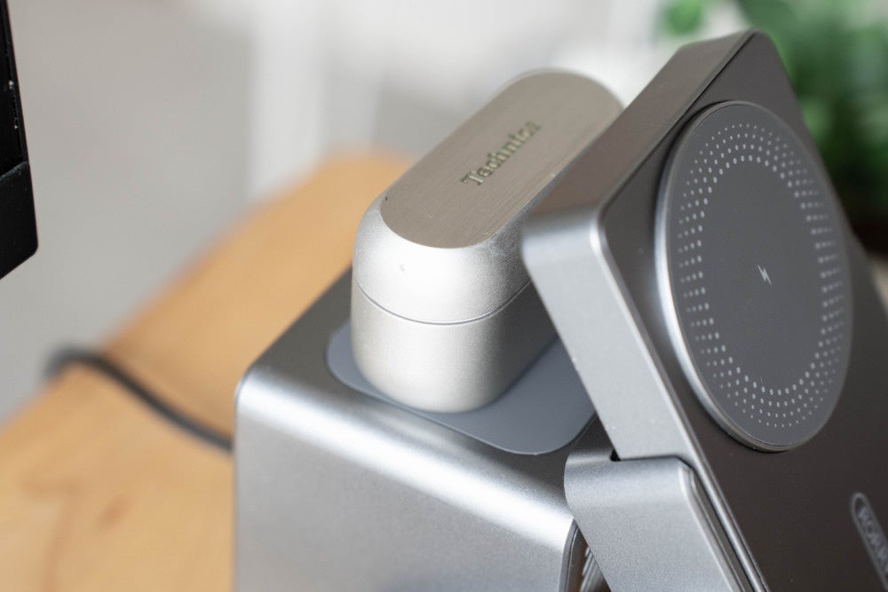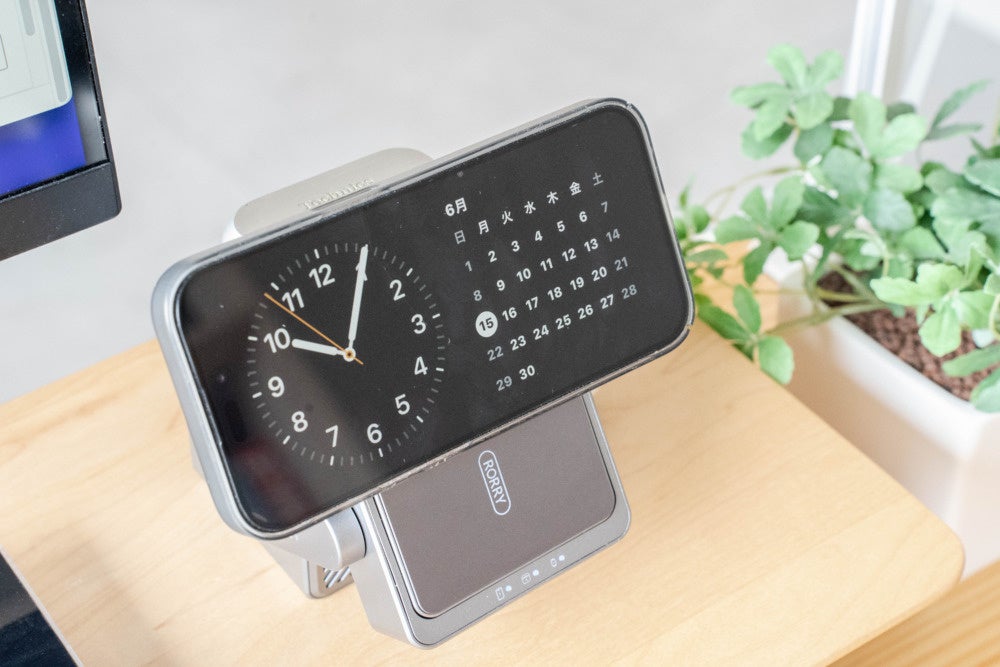 iPhone充電部は可動式になっていて、角度を自由に調整できます。なお、MagSafe出力は最大15Wでますが、最新の高速充電規格であるQi2には対応していないので、そこだけ注意ポイント。