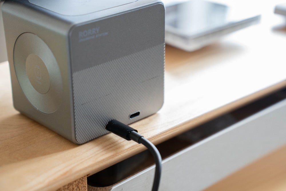 3-in-1モデルの一般的な板状や丸みを帯びた形状とは違い、珍しいキューブ形状が特徴的な充電ステーション本体。