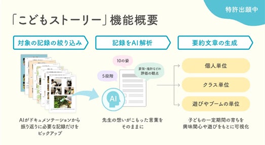 保育現場で、最も負担が大きい業務のひとつといわれる児童票(※1)や要録(※2)の作成業務。これらは過去の大量の記録を振り返ってまとめる必要があり、園運営上の課題となっています。「こどもストーリー」は、保育者が日々作成する保育記録「保育ドキュメンテーション」をもとに、AIが児童票や要録などの保育の振り返り作業をサポートし、負担を大幅に軽減します。また、子どもの成長を「5領域」や「10の姿」といった育ちの観点で要約することで、保育者に新たな気づきを与えてくれるほか、中長期の成長を保護者に伝えることも容易になり、保育の質の向上につながるサービスです。