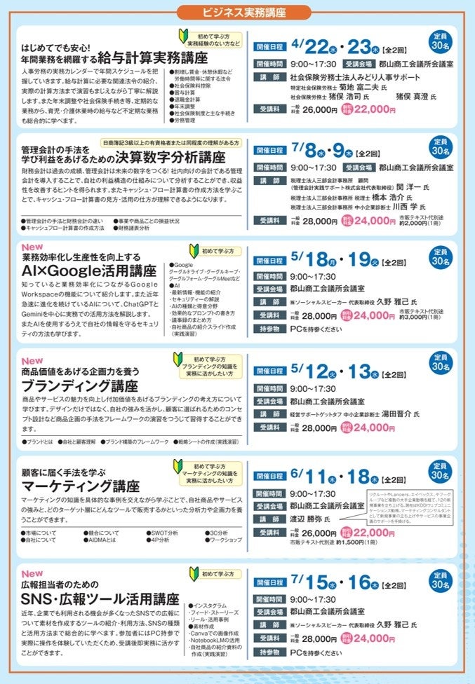 ビジネススクールでは、地域企業の人材育成を支援するための研修講座を開講しています。会員企業従業員や、求職者などを対象とした割引制度を設けております。是非、スキルアップのためご活用ください。
