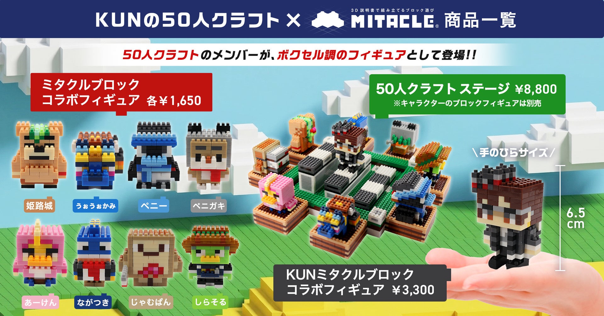 これまでになかったグッズ化のアプローチで、KUNと個性豊かな参加勢(姫路城、うぉうぉかみ、ペニー、ペニガキ、あーけん、ながつき、じゃむぱん、しらそる)9名を、ボクセル(空間ピクセル)技術で精巧に立体化。ミタクルブロックが「KUNの50人クラフト」の世界をはじめてリアルに届けます。また、キャラクターフィギュアは別売のブロックステージ「50人クラフト ステージ」も販売。各キャラクターフィギュアと組み合わせることで、企画の世界観をデスク上に再現できます。