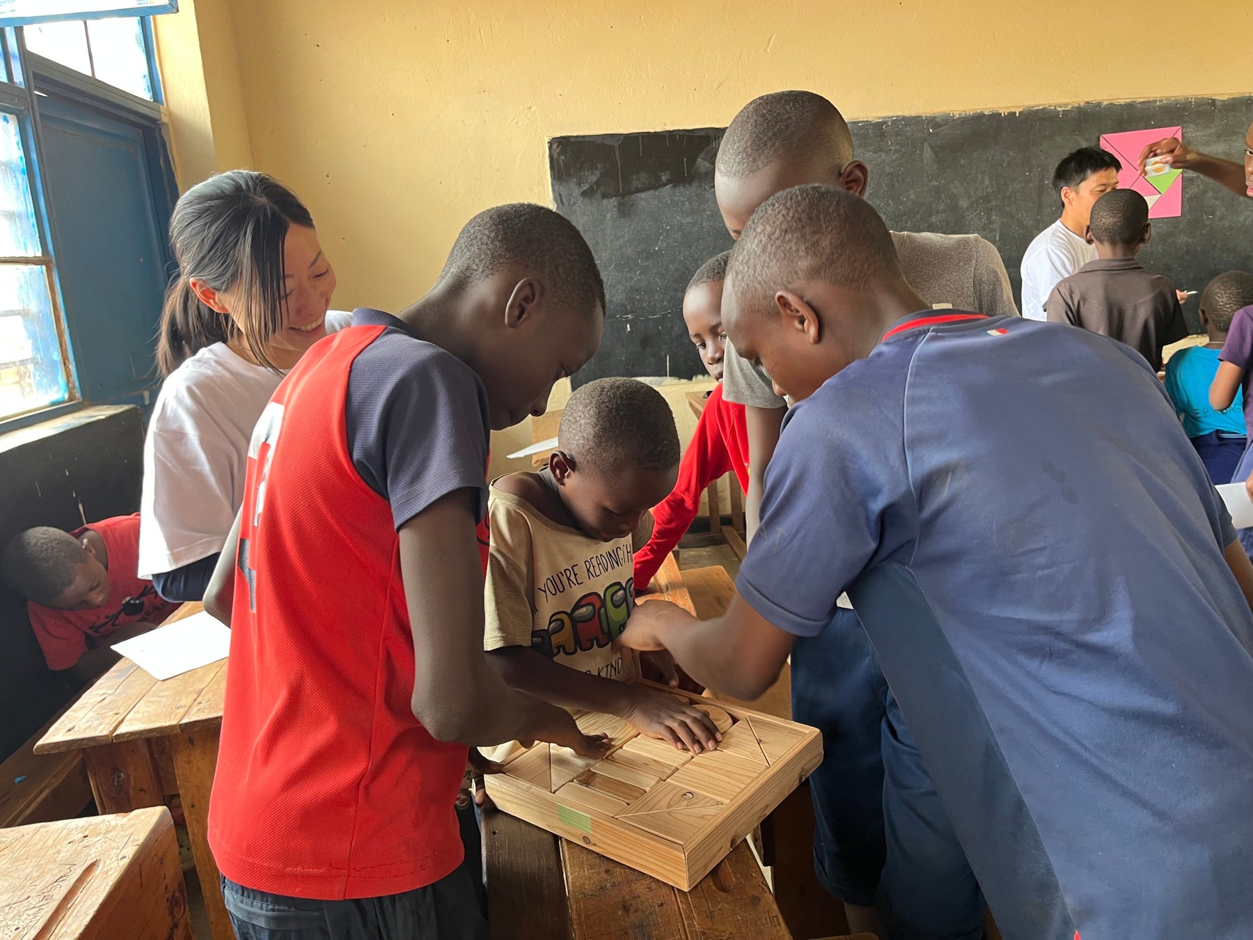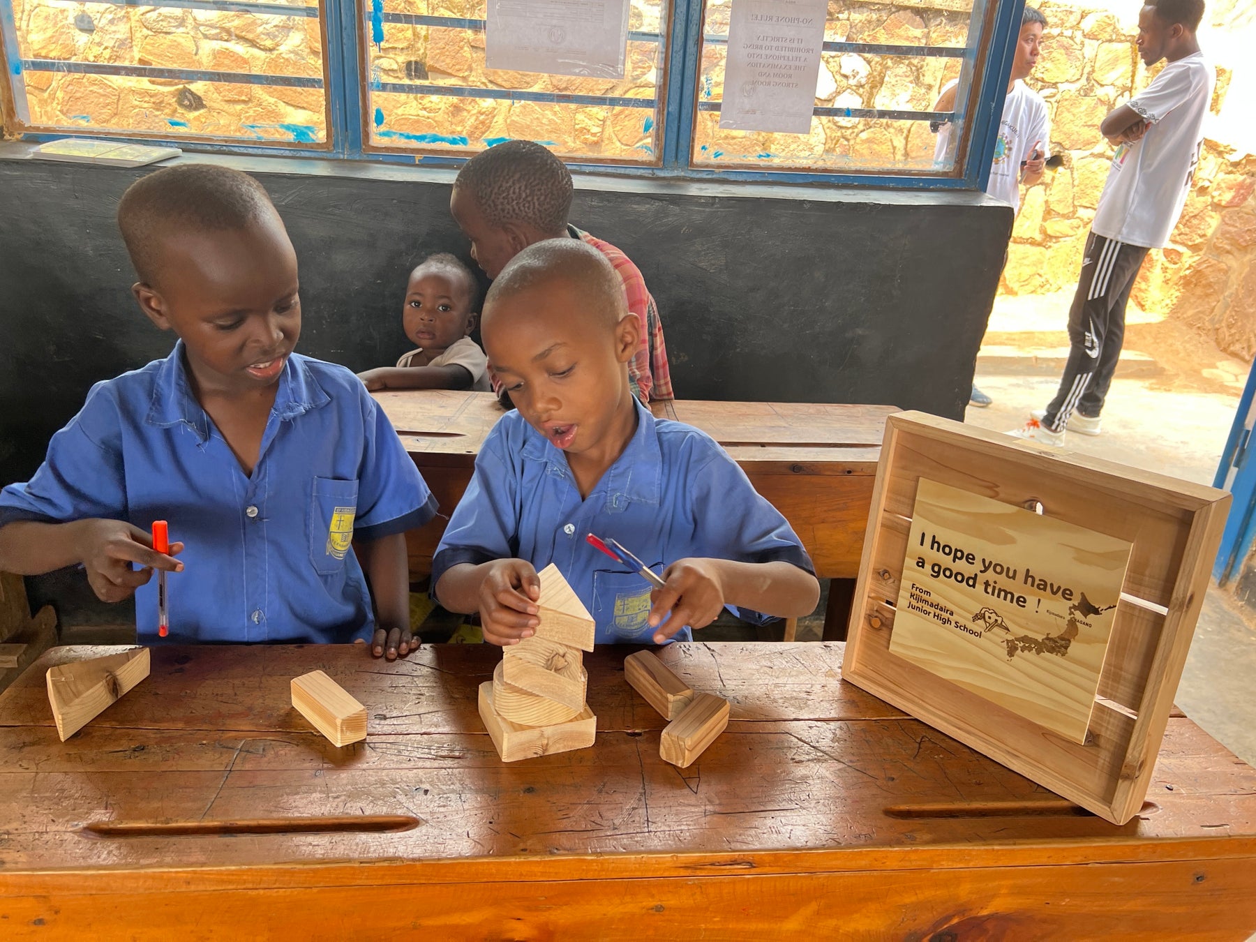 木島平中学校は村の木材資源を生かした工作が盛んで、中学校からなかよし学園に積み木「木島平 PEACE ブロック」が寄贈され、8月に行ったルワンダでの活動に使われました。この授業はルワンダキガリにあるキバガバガ小学校で行われ、「耐震強度のある建物を作ろう」というテーマで授業を行いました。