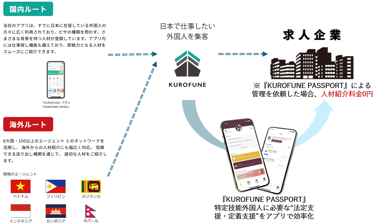 KUROFUNEは、特定技能制度にもとづき、外国人労働者の生活・就労支援を担う登録支援機関の業務をアプリで提供しています。従来、労働集約的におこなわれていた事務作業を大幅に効率化し、支援の品質向上と人材の定着率改善を同時に実現。支援機関の業務を根本からアップデートするサービスです。