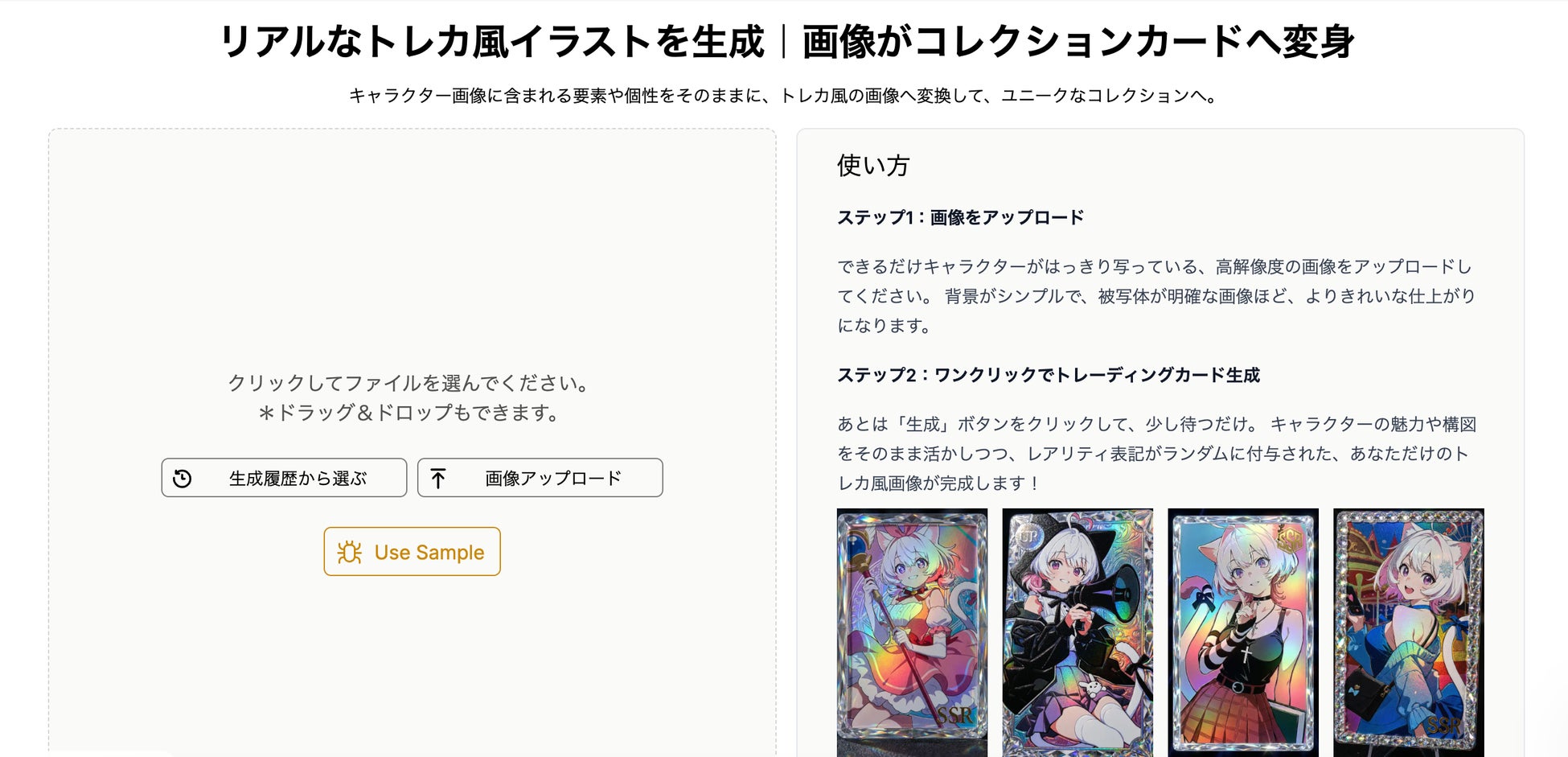 「トレカ風生成ツール」は、お好きなキャラクターやオリジナルキャラクターのイラストをアップロードするだけで、カード枠や質感表現を加えたトレーディングカード風ビジュアルを自動生成できる機能です。
