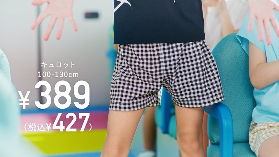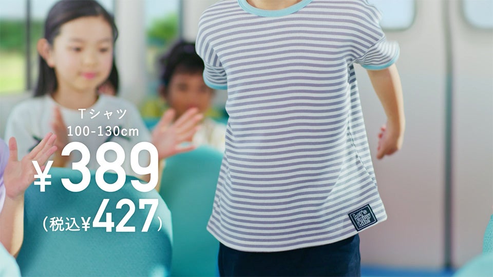 トドラーサイズ(100~130cm)の元気なお子さまの夏のマストアイテムであるTシャツ、ハーフパンツ、キュロットが登場します。こちらも昨年から価格を維持し、389円(税込427円)でご提供。プチプラでありながら、かしこく、かわいらしく、お子さまに「ちょうどいいふく」としての価値を、通学バスのランウェイで繰り広げられる子供たちのファッションショーを通じて表現します。車内のイスや天井の模様は撮影用に制作しており、バス車内をランウェイのように歩く子どもたちの姿は自信に満ちあふれ、まるで本当のモデルさんのようでした。