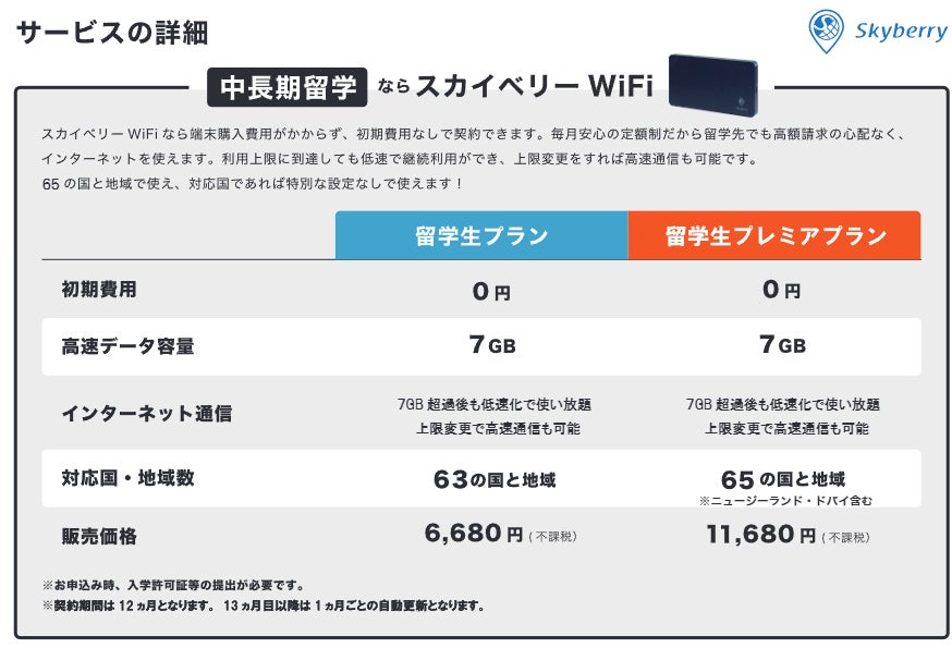 スカイベリーⓇは、これまでの「留学生プラン」に新たに4の国と地域を追加、さらに日本でのテスト通信を可能としたリニューアルを行いました。リニューアルしても初期費用、月額料金は変わらずご利用いただけます。また、これまでの「留学生プラン」に加え、近年、留学先として注目されている、ニュージーランド、ドバイを利用可能とした新プラン「留学生プレミアプラン」を新たにリリース致します。