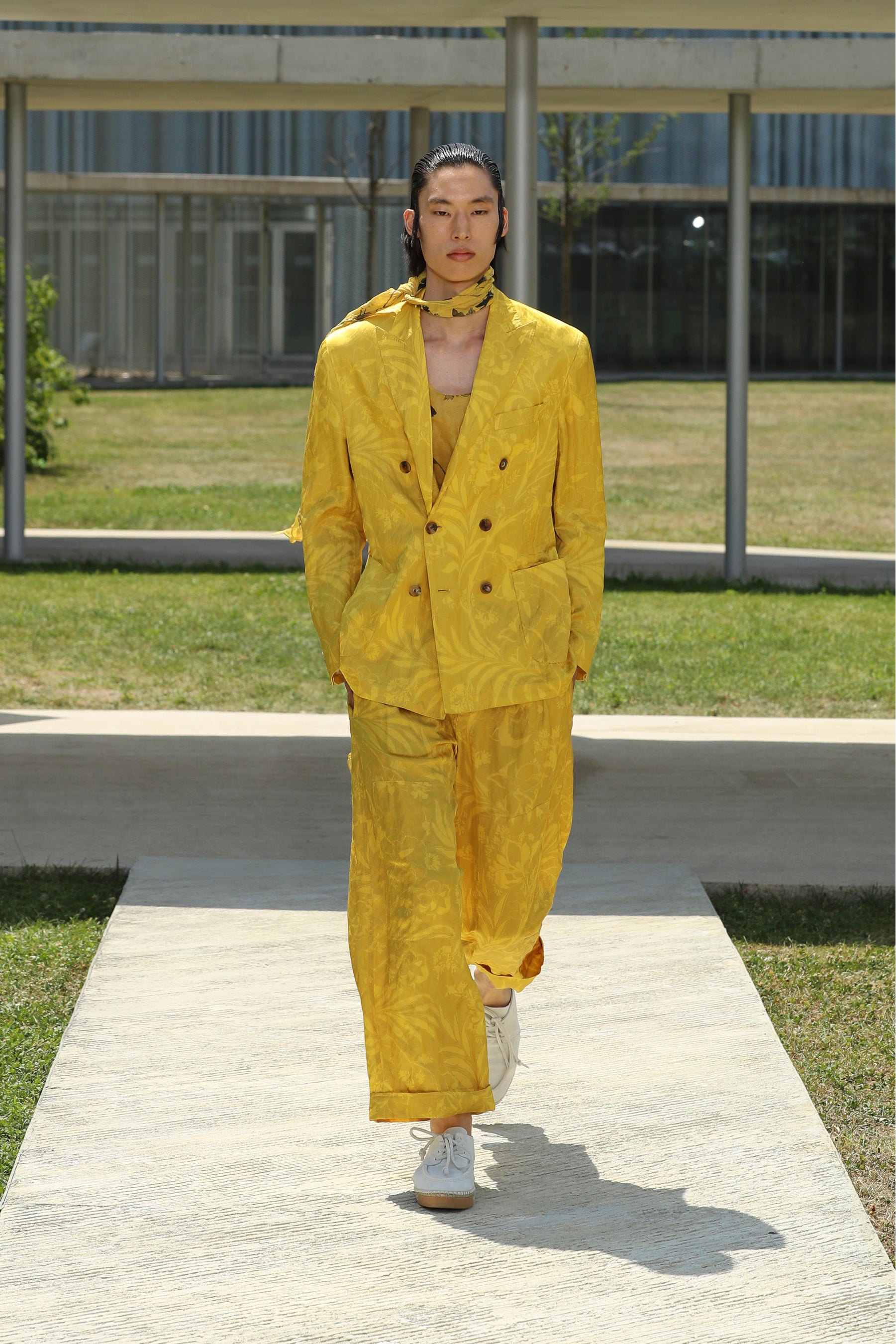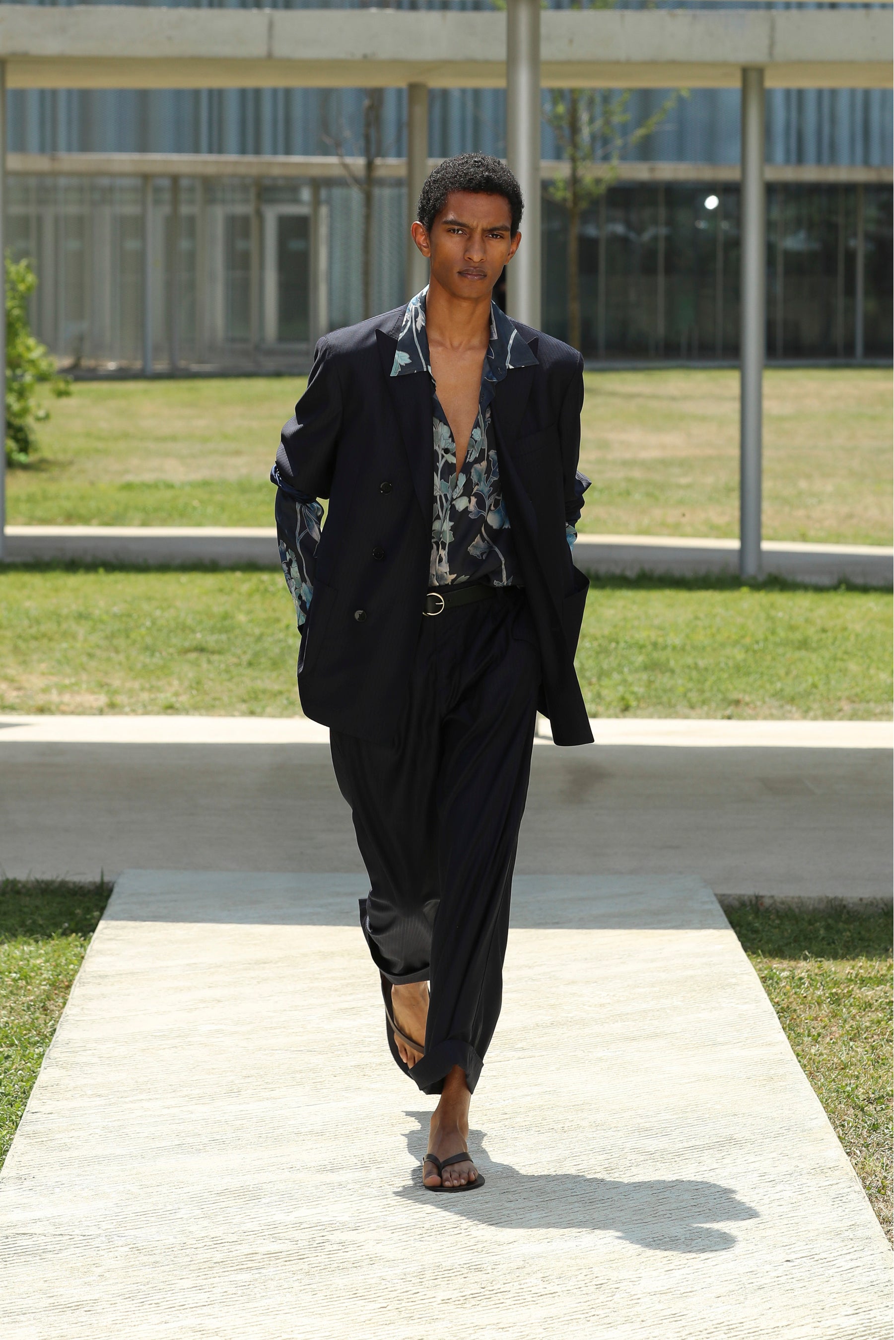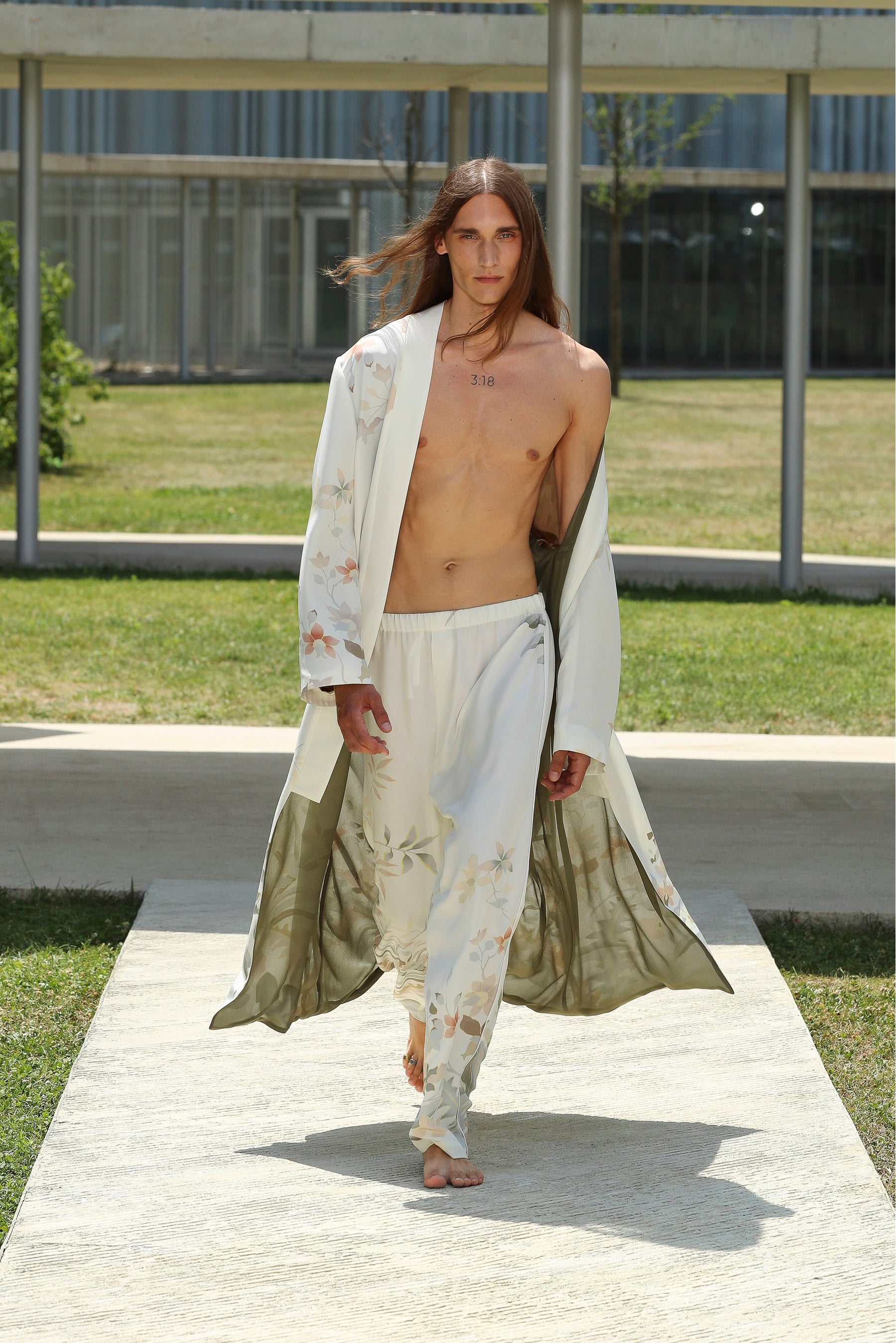 網目の間から、Tシャツやシャツに施したサンガロのカッティングから、透けるように繊細なシルクカフタンやリネンのダスターコートや、はためくクラッシュドサテンのテーラードスーツ、シャツと合わせたスイミングトランクスから、彼の身体は顕わになります。緩やかなシルエットはソフトで、動きに合わせて変化します。ロープソールの靴やサンダルは、軽さの概念を封印。もしくは、彼は裸足になって大地と繋がり、優しいエロティシズムを帯びて、「ドルチェ・ファール・ニエンテ(何もしないことの喜び)」のユートピアとして詩を讃えるのです。