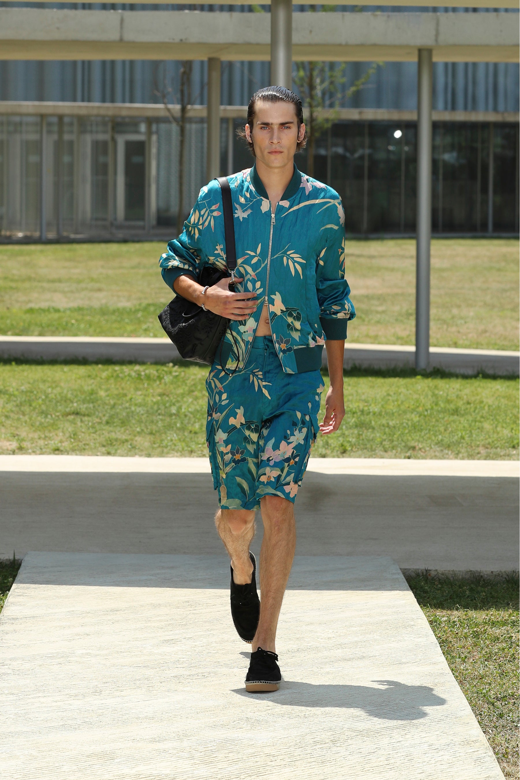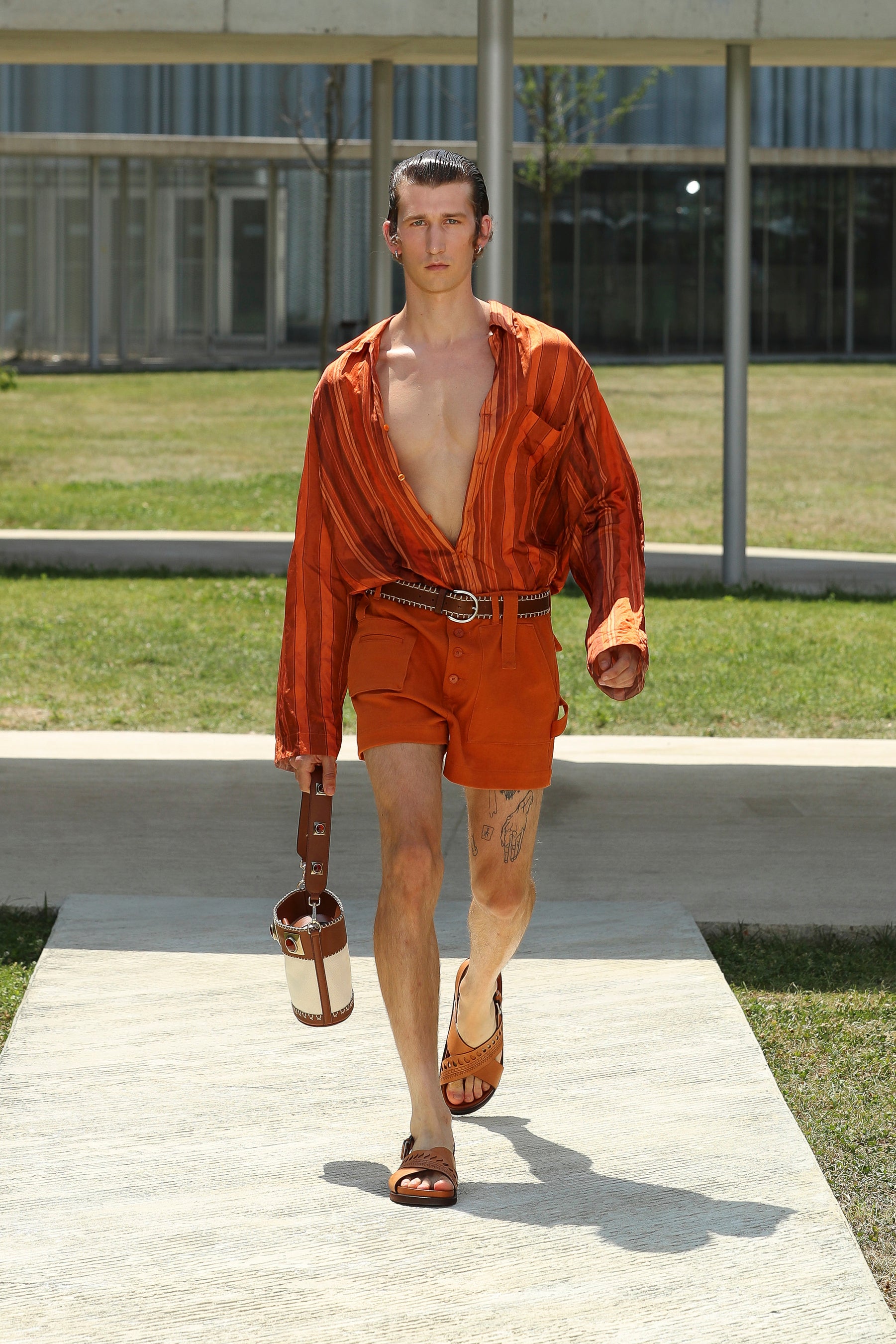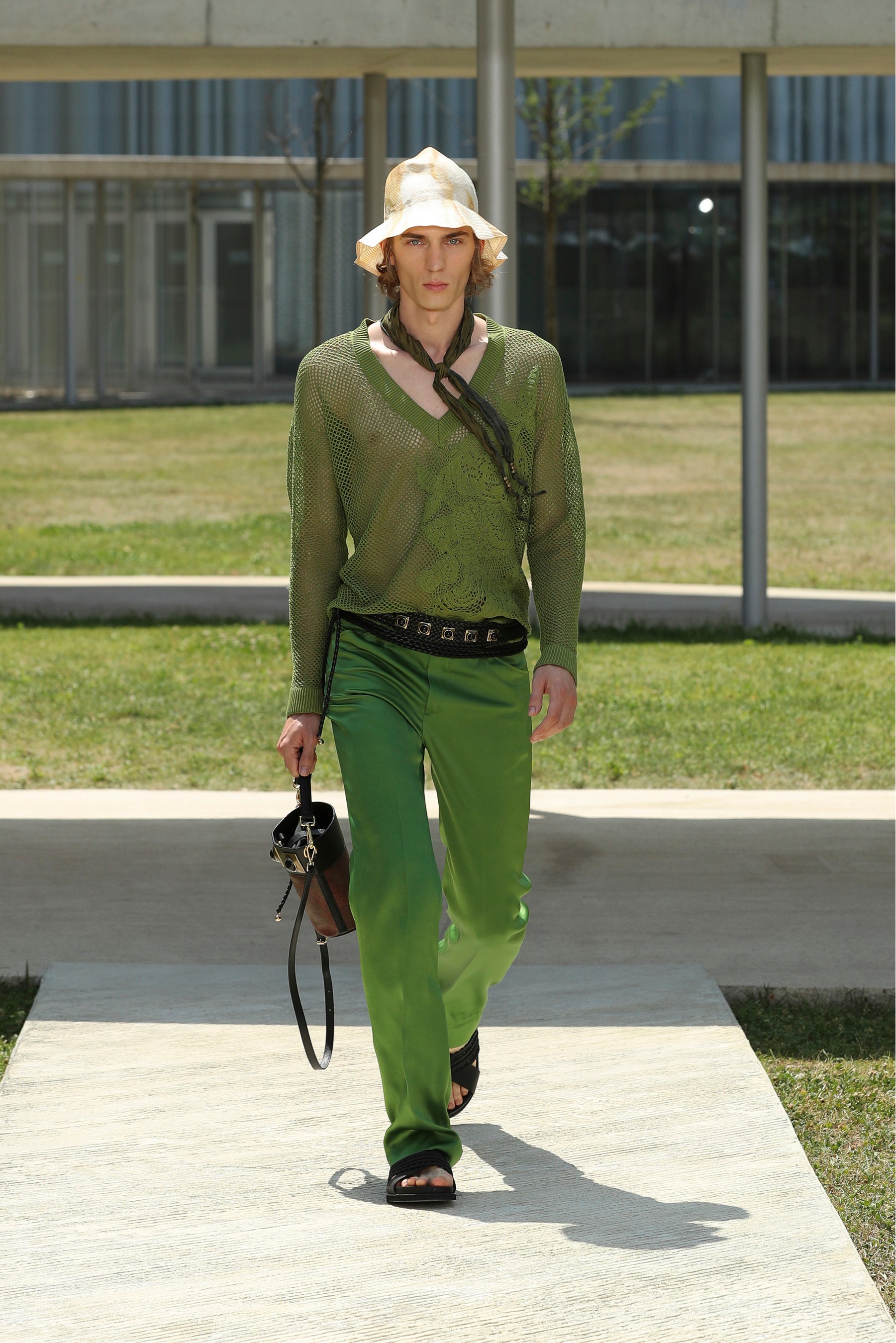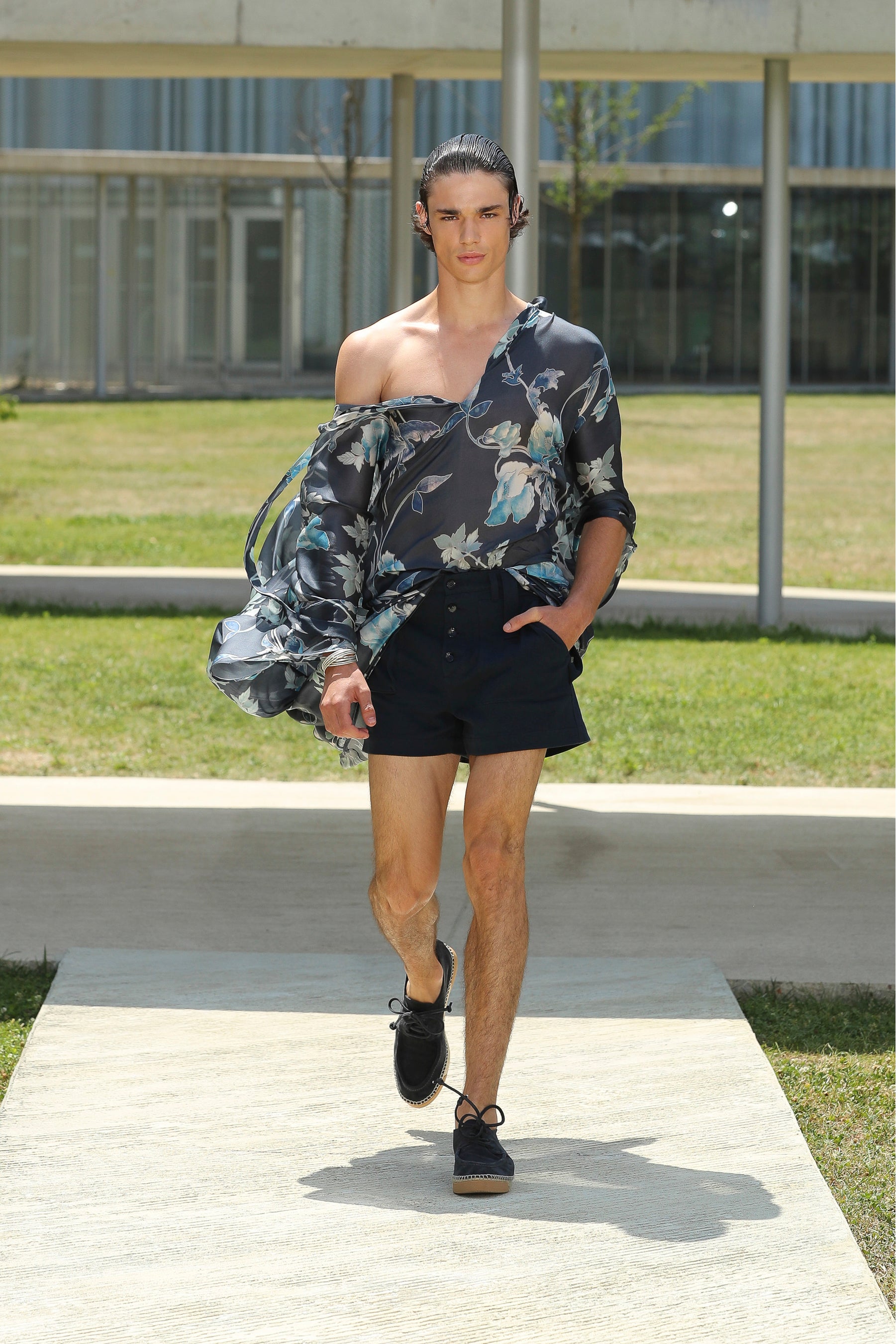 網目の間から、Tシャツやシャツに施したサンガロのカッティングから、透けるように繊細なシルクカフタンやリネンのダスターコートや、はためくクラッシュドサテンのテーラードスーツ、シャツと合わせたスイミングトランクスから、彼の身体は顕わになります。緩やかなシルエットはソフトで、動きに合わせて変化します。ロープソールの靴やサンダルは、軽さの概念を封印。もしくは、彼は裸足になって大地と繋がり、優しいエロティシズムを帯びて、「ドルチェ・ファール・ニエンテ(何もしないことの喜び)」のユートピアとして詩を讃えるのです。
