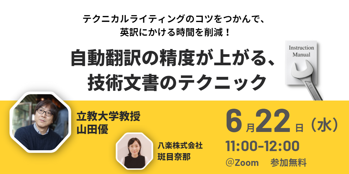 AI+人で生産性を高めるAI自動翻訳プラットフォーム「ヤラクゼン」を提供する八楽株式会社(所在地:東京都渋谷区、代表取締役:坂西優)は、無料オンラインセミナー『自動翻訳の精度が上がる、技術文書のテクニック』を2022年6月22⽇ (水)に開催いたします。
